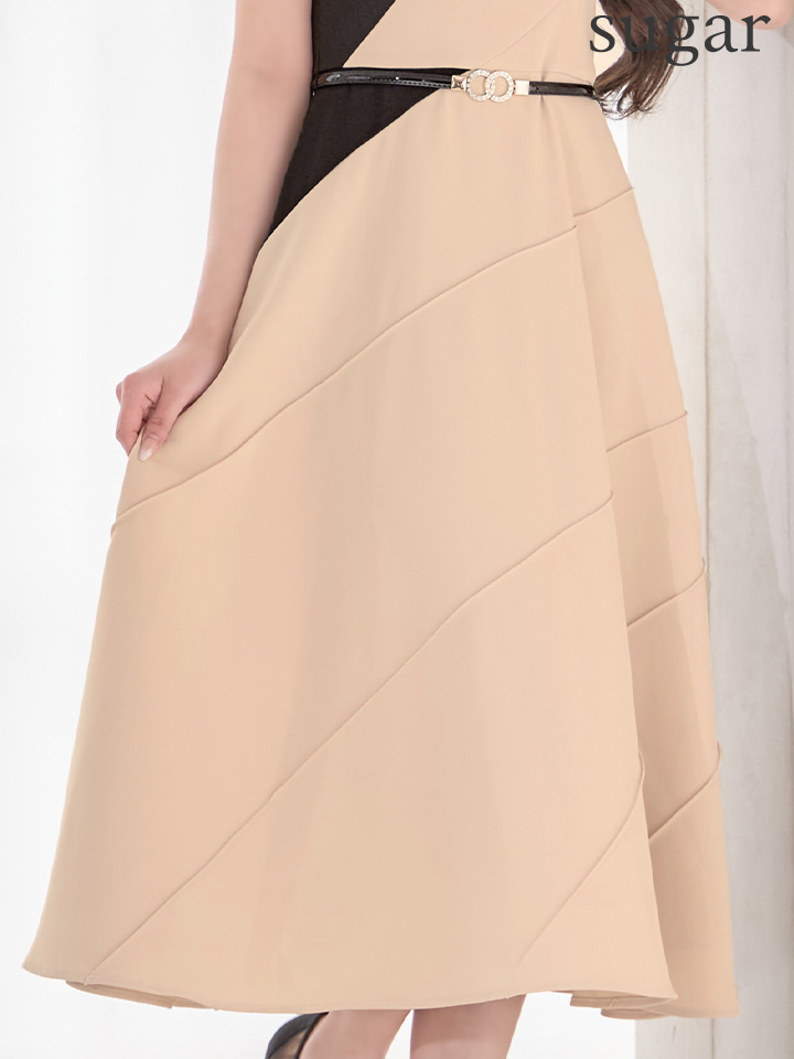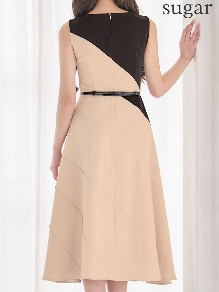 XS-Lサイズあり 【GINZA COUTURE/銀座クチュール】バイカラー/ ベルト/ ノースリーブ/ フレア/ Aライン/ ワンピース/ ミディアムドレス/ キャバドレス[OF2] [LKC25292-BxBE-S2602]