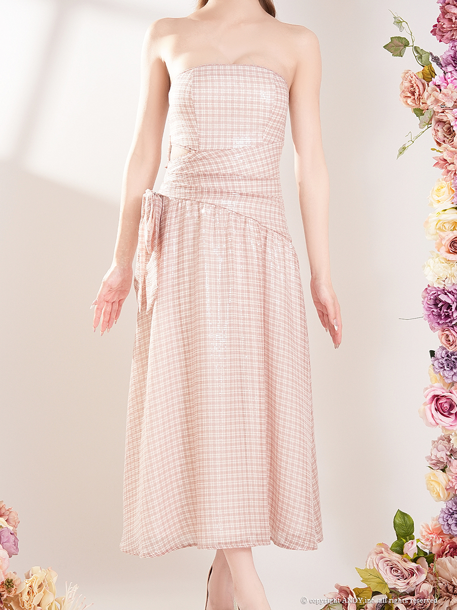 XSサイズあり【an/アン】チェック/ 格子柄/ ウエストリボン/ ラメ/ ベアトップ/ フレア/ ワンピース/ ミディアムドレス/ キャバドレス[OF05] [AOC4082-B-2602]