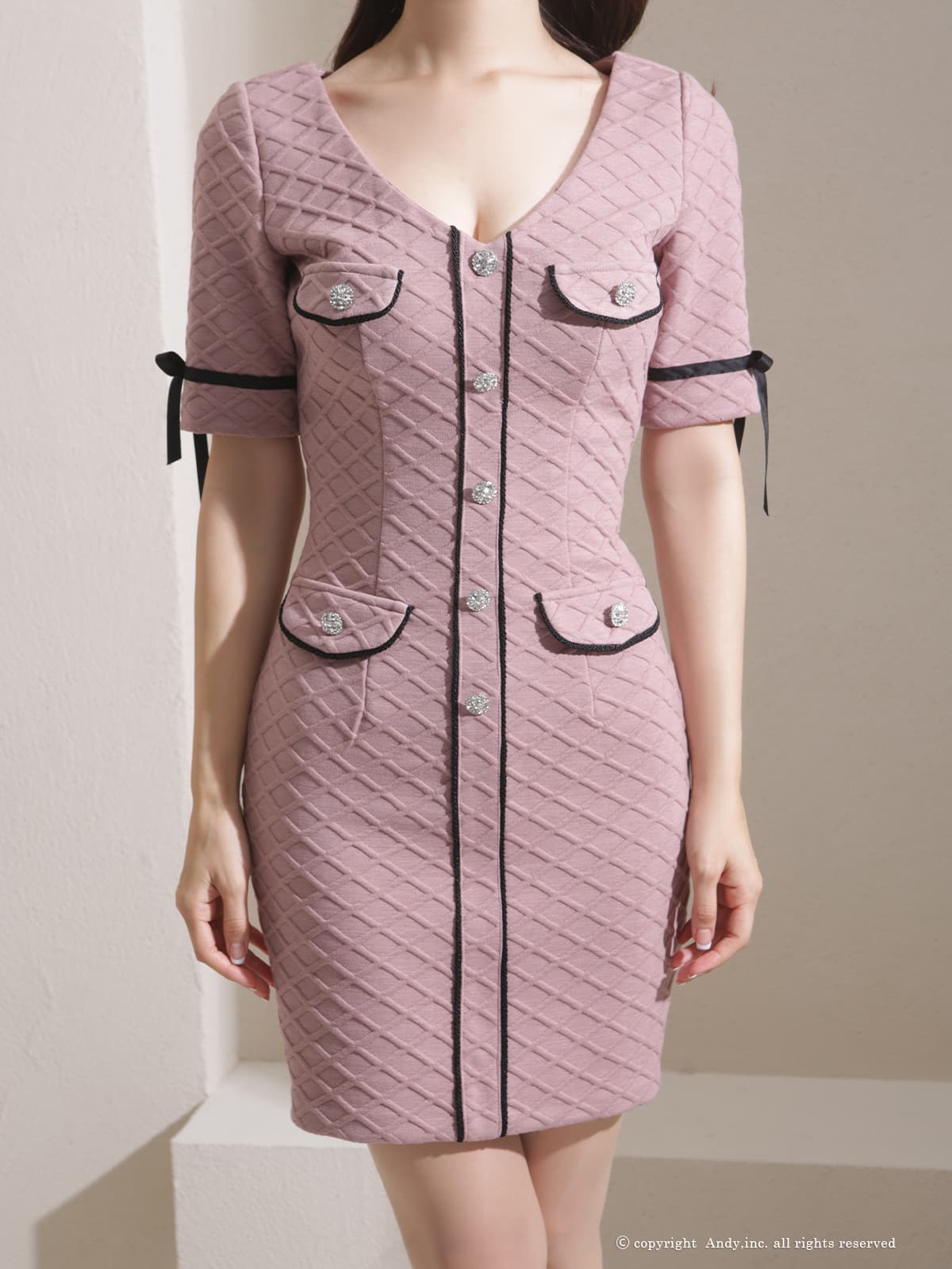 【ANDY/アンディ】ダイヤ柄/ ハーフスリーブ/ ビジューボタン/ Vネック/ リボン/ ジャガード/ ストレッチ/ タイト/ ミニドレス/ キャバドレス[OF05] [ON2956-P-2602]