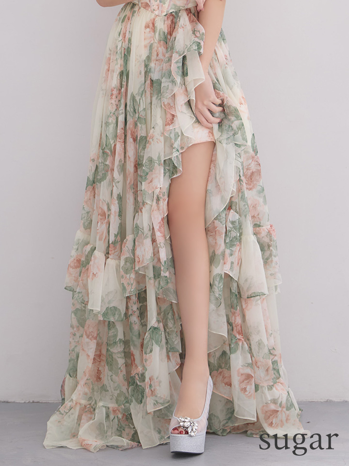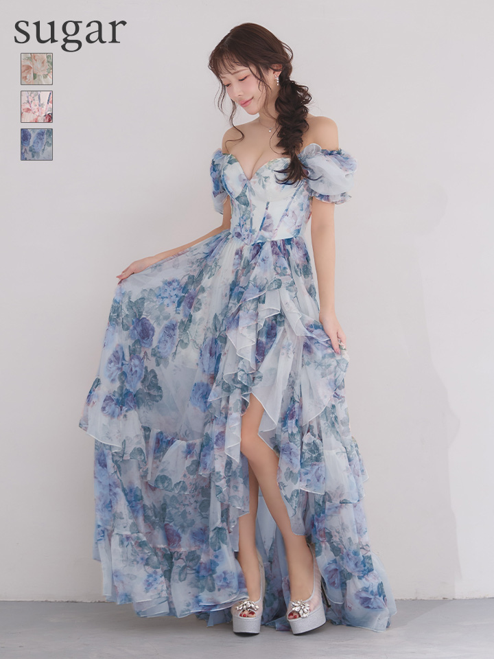 【IRMA/イルマ】ティアード/ フリル/ オフショル/ パフスリーブ/ テールカット/ フラワープリント/ シフォン/ フレア/ プリンセス/ ロングドレス/ キャバドレス long[OF2A] [61059-IR-CM-S260228]