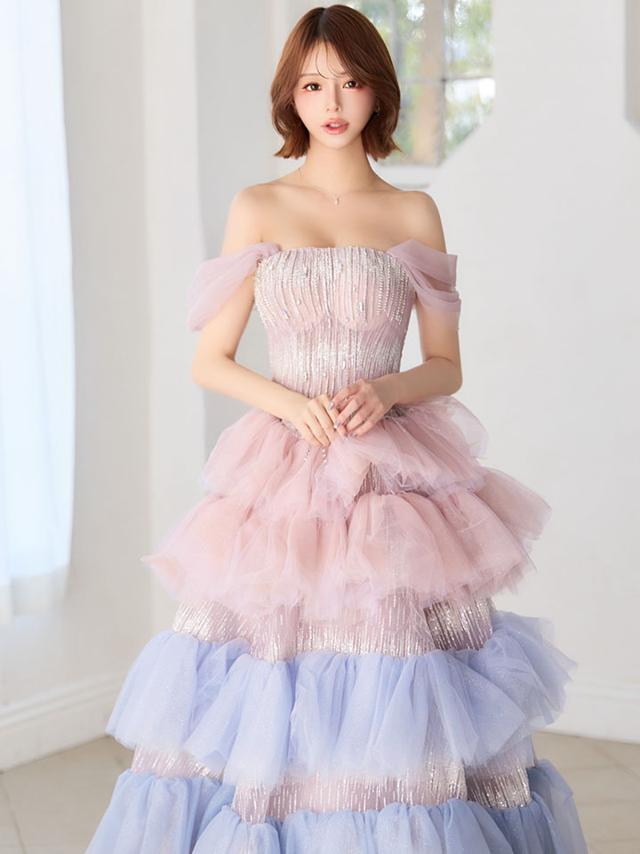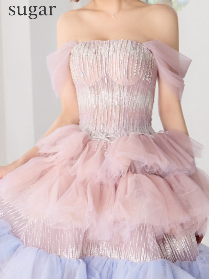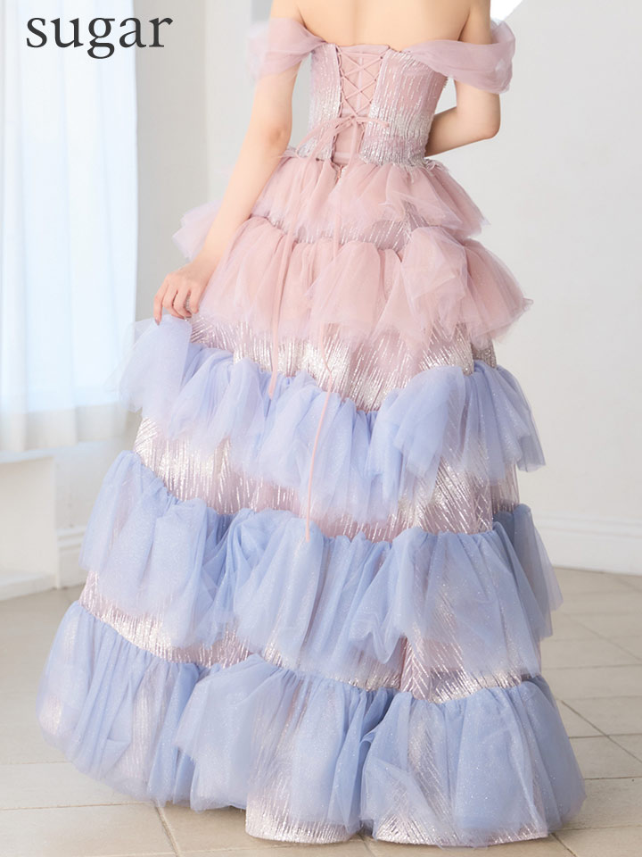 【couture an/クチュールアン】オフショル/ チュール/ ティアードフリル/ ラメ/ ラインストーン/ ビジュー/ リボン/ スパンコール/ バイカラー/ フレア/ プリンセス/ ロングドレス/ キャバドレス long[OF05] [AOC-WD-058-PBL-S260228]