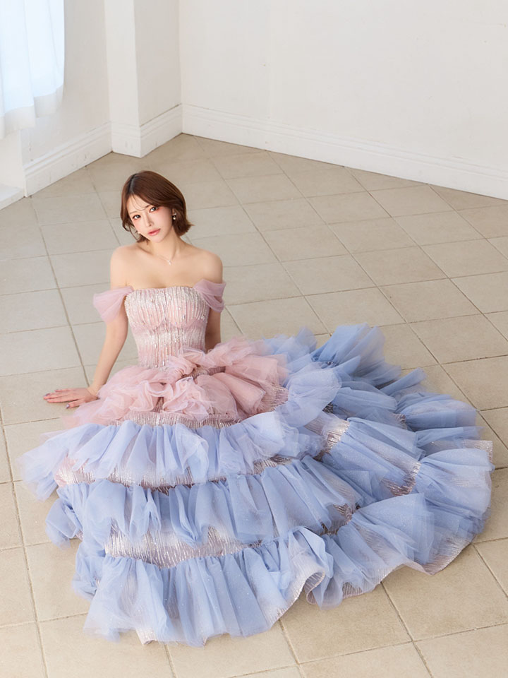 やわらかなピンク×ブルーのバイカラーが可憐な印象を与えるプリンセスロングドレス。