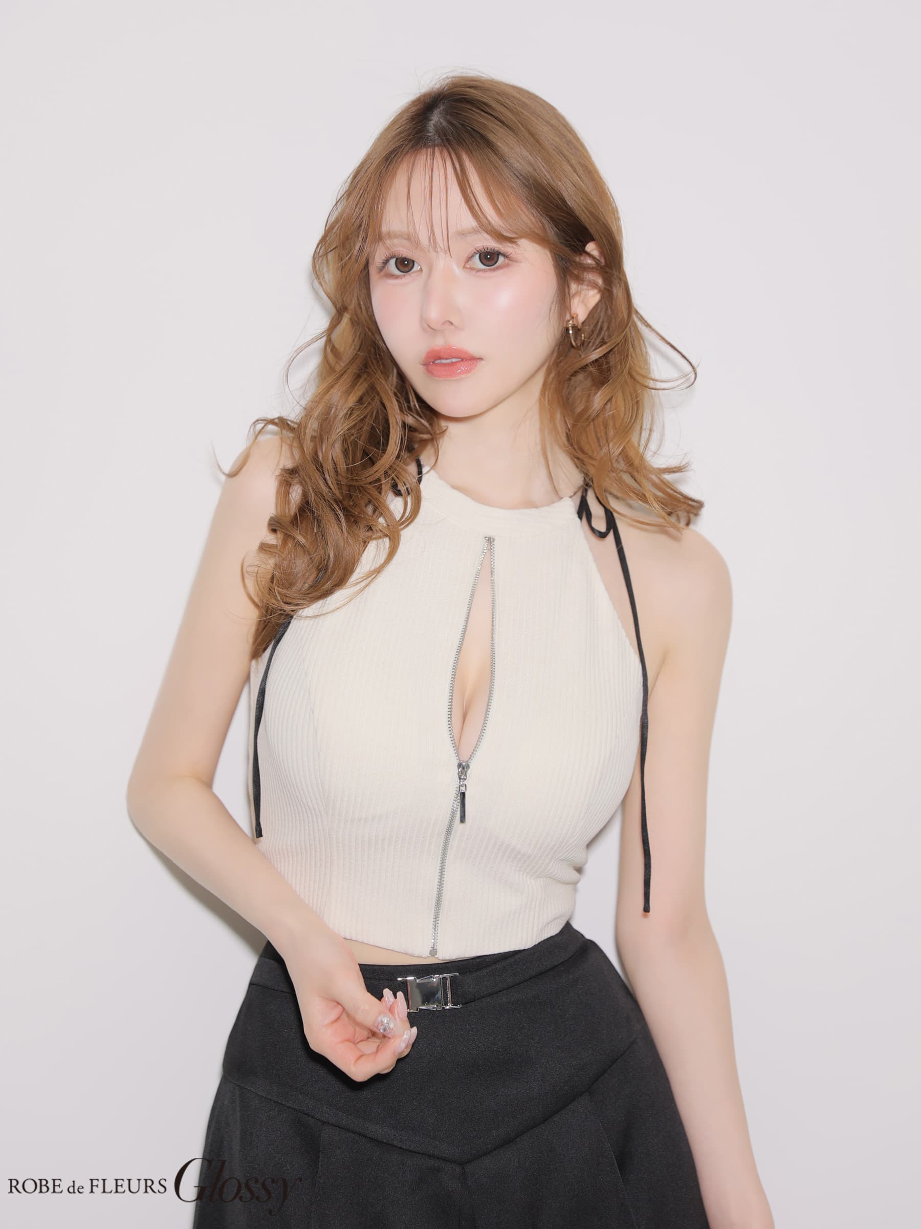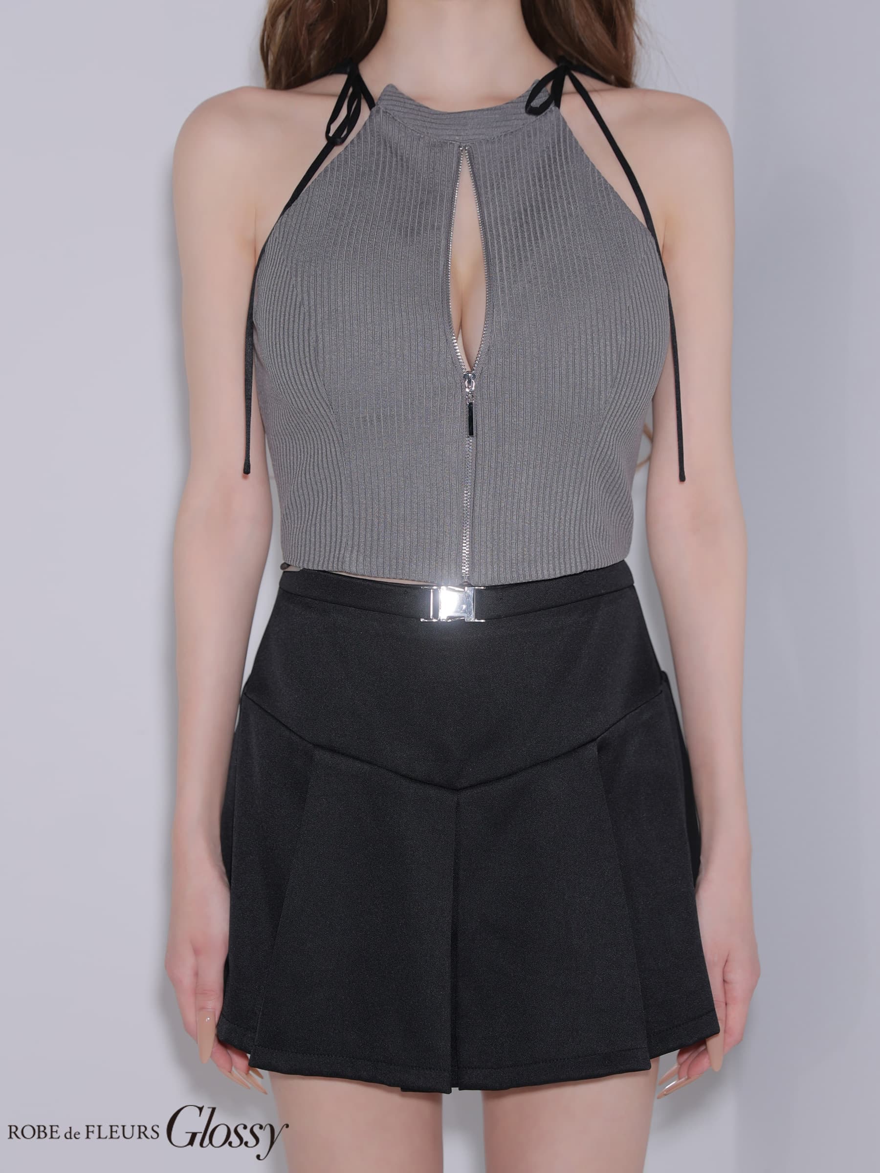 女性らしいシルエットながらバストファスナーやバックルベルトが
