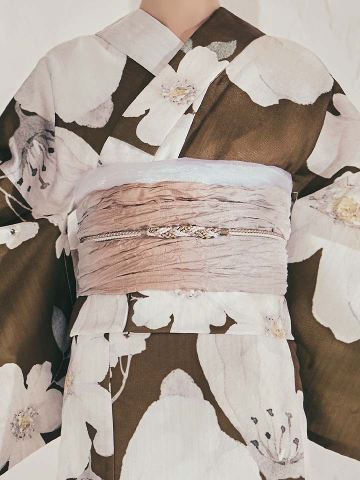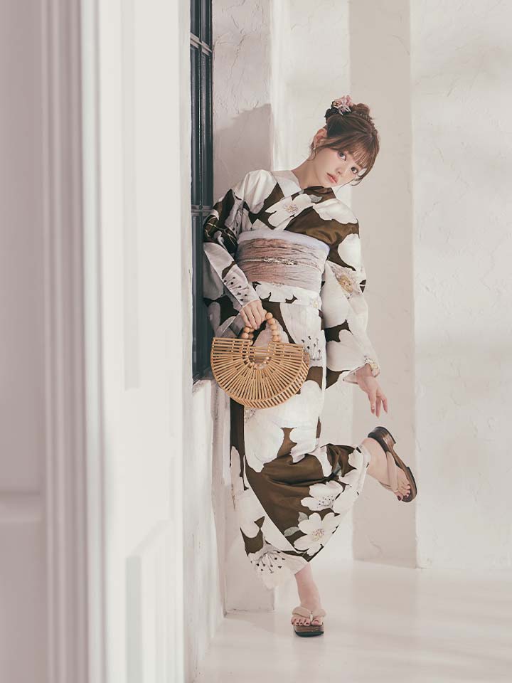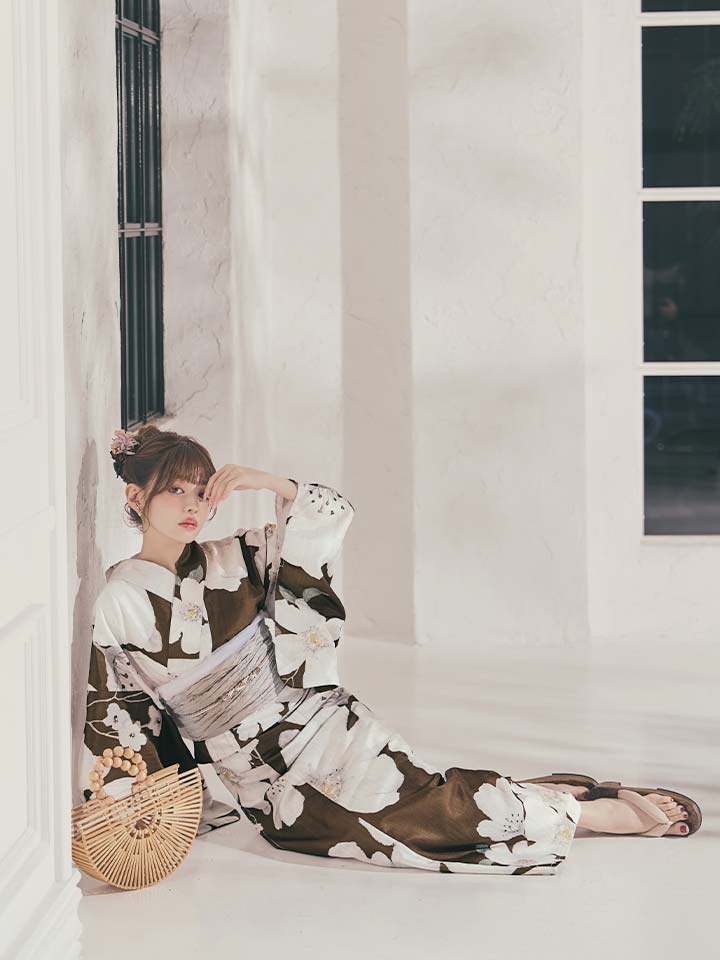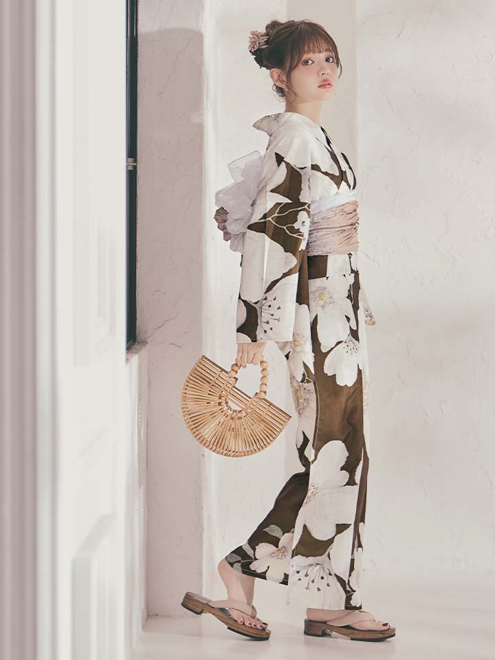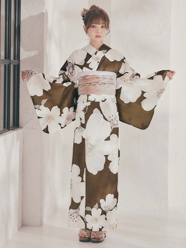 ブラウン地に白花が映える、甘さ控えめな大人モード浴衣