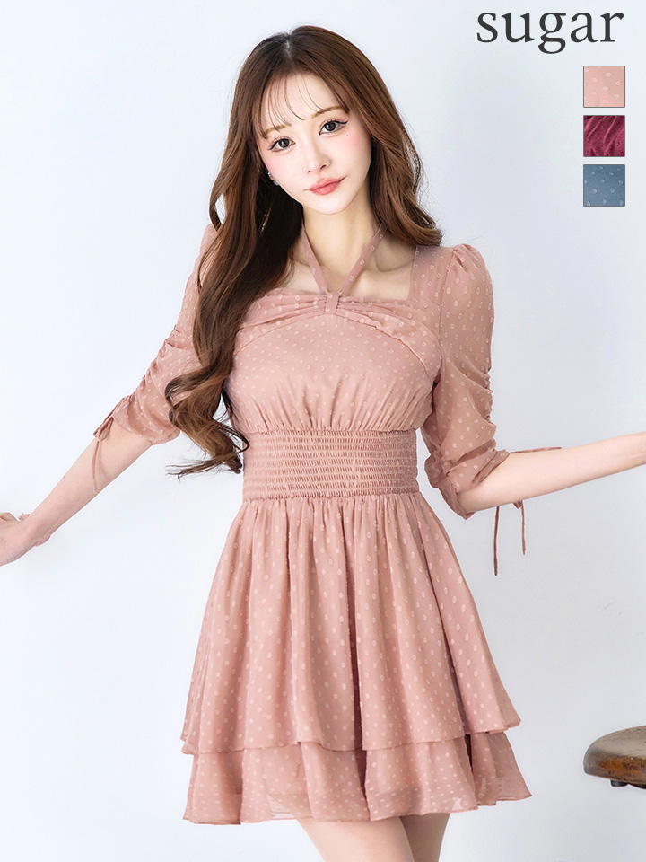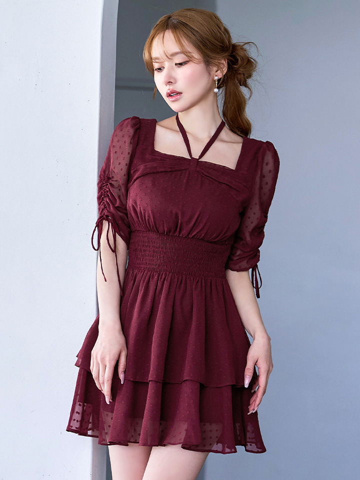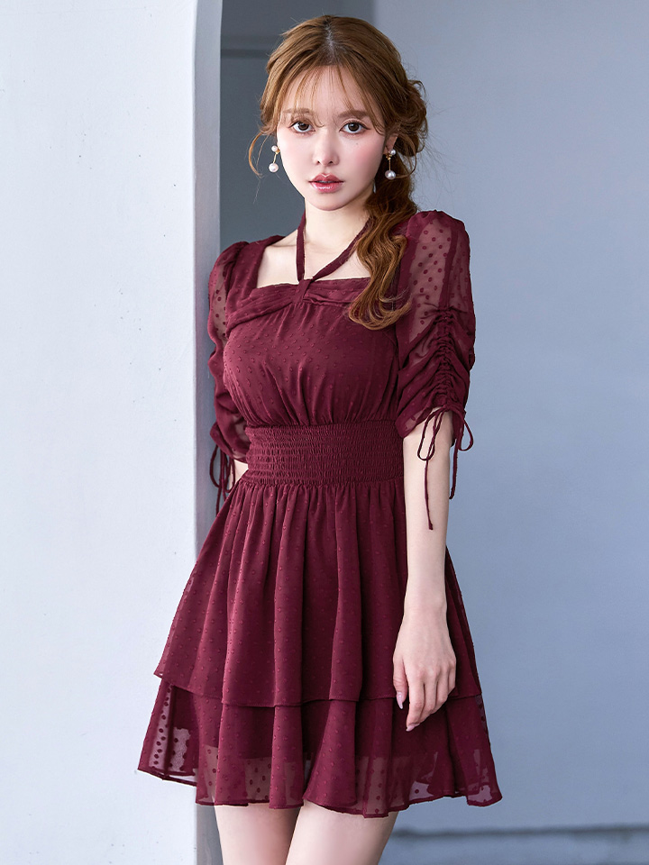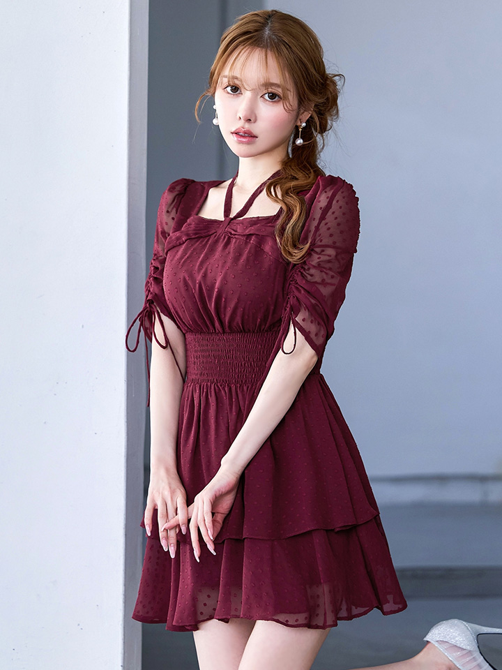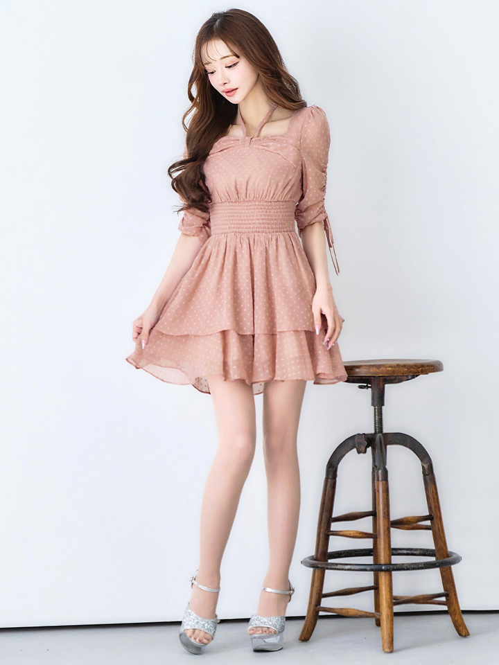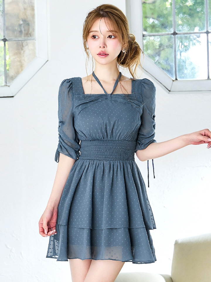 ドットシアーを重ねた軽やかな素材感が大人可愛いフレアミニドレス。