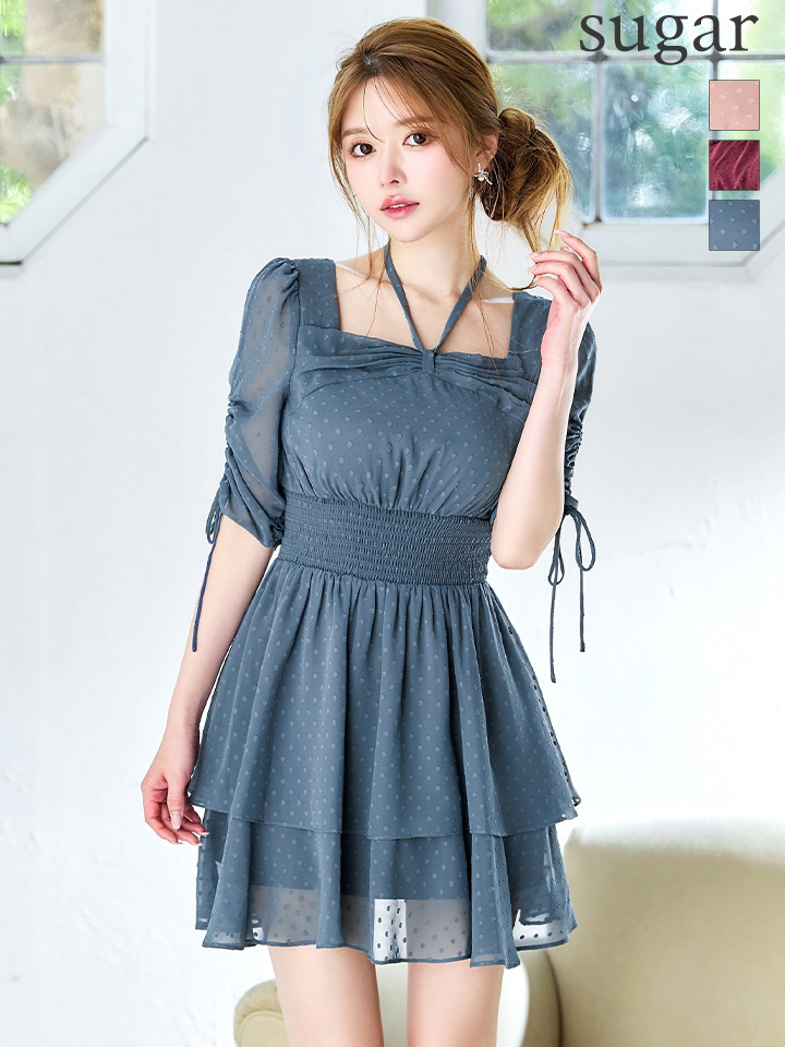 XS-Lサイズあり【Donia Quinn / ドニアクイーン】 ドット/ 袖付き/ シャーリング/ フリル/ スクエアネック/ ティアード/ ウエストマーク/ ストレッチ/ フレア/ ミニドレス/ キャバドレス[OF05] [Q60255Y-BGD-S2603]
