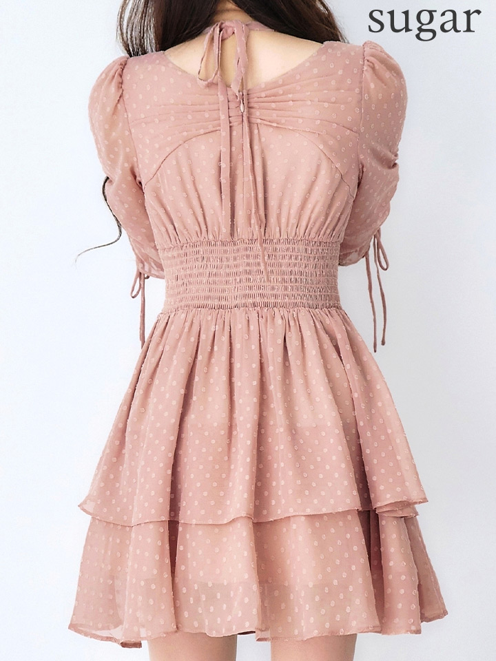 袖のリボンデザインとふんわりとしたティアードスカートが可憐さを引き立てる一着です