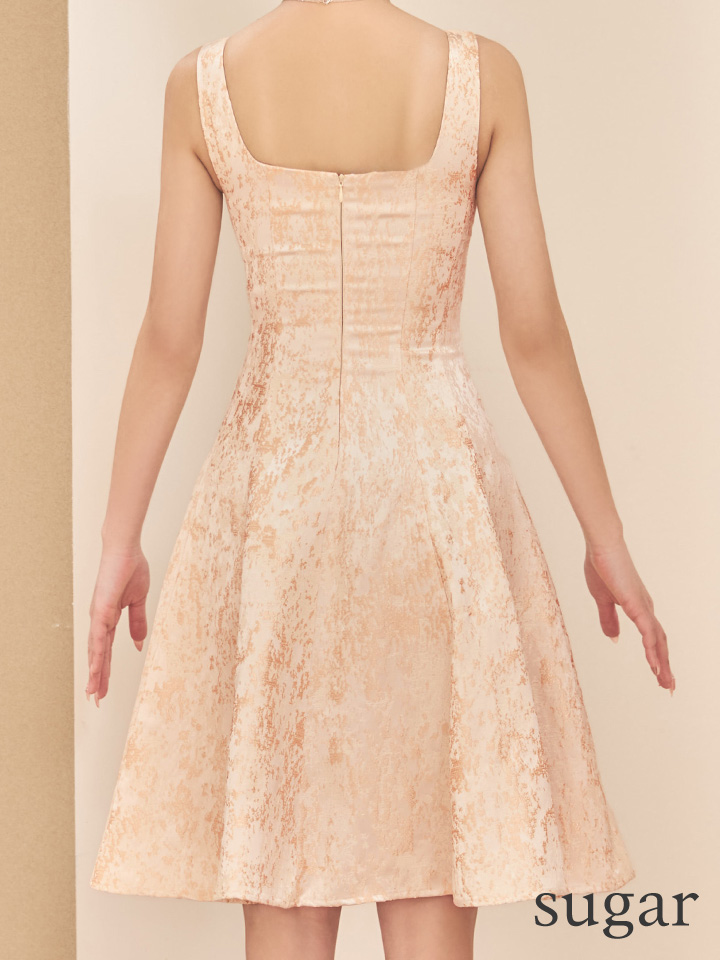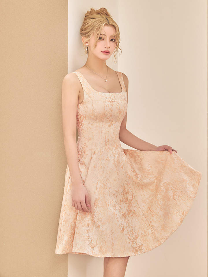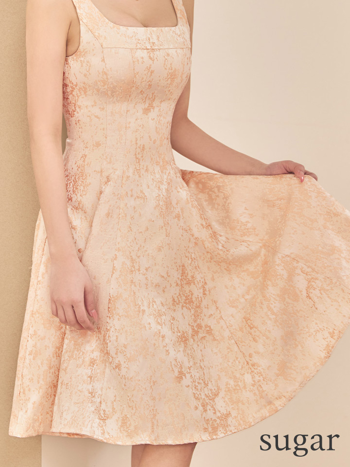 スクエアネックがデコルテをすっきりと見せ、ウエストから広がるシルエットが女性らしさを演出