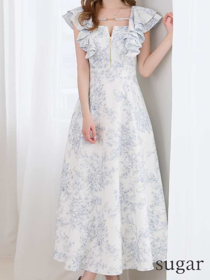 フリルにプリントされた花柄が、春を感じさせるワンピースドレス♡