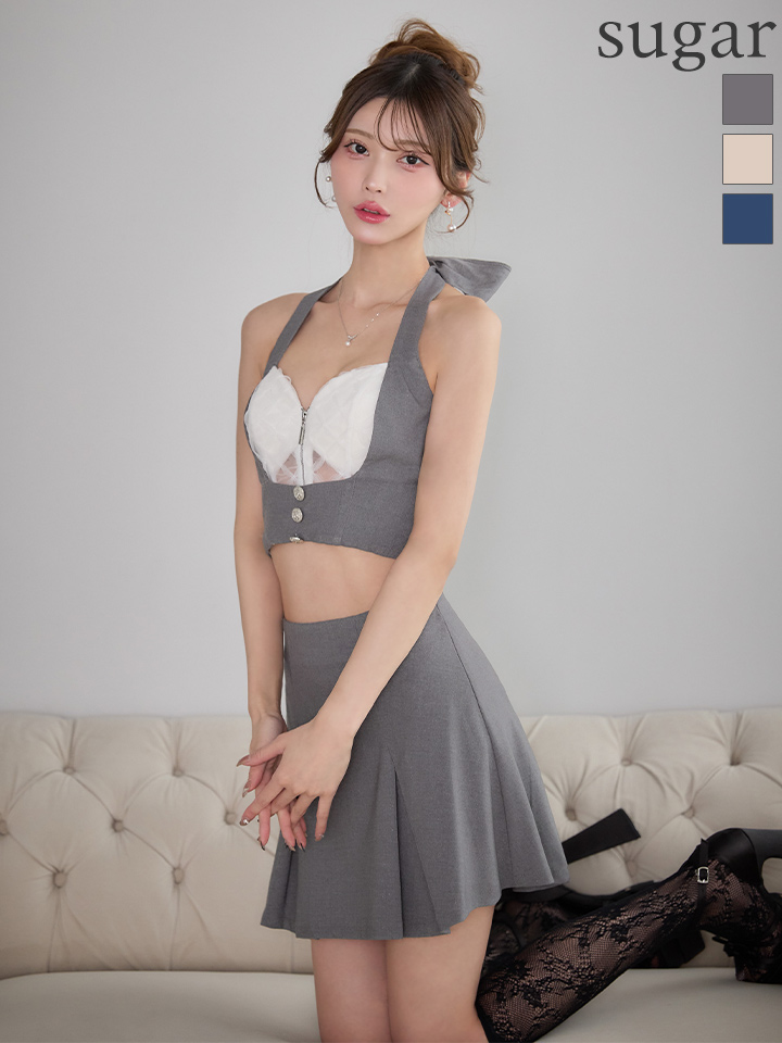 XSサイズあり【an/アン】ホルターネック/ バックリボン/ バストジップ/ ノースリーブ/ シアーレース/ プリーツ/ フレア/ セットアップ/ ミニドレス/ キャバドレス[OF05] [AOC4050-WxBE-S260313]