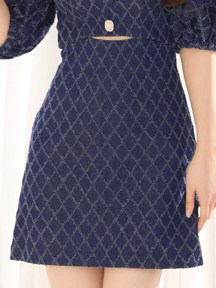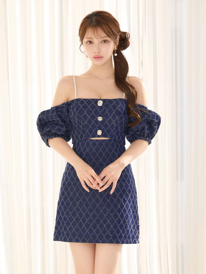 XSサイズあり【ANGEL R/エンジェルアール】デニムデザイン/ オフショルダー/ パフスリーブ/ ウエストカット/ ボタン/ チェーンショルダー/ マイクロミニ/ フレア/ ミニドレス/ キャバドレス[OF2] [AR25825-NV-S260316]