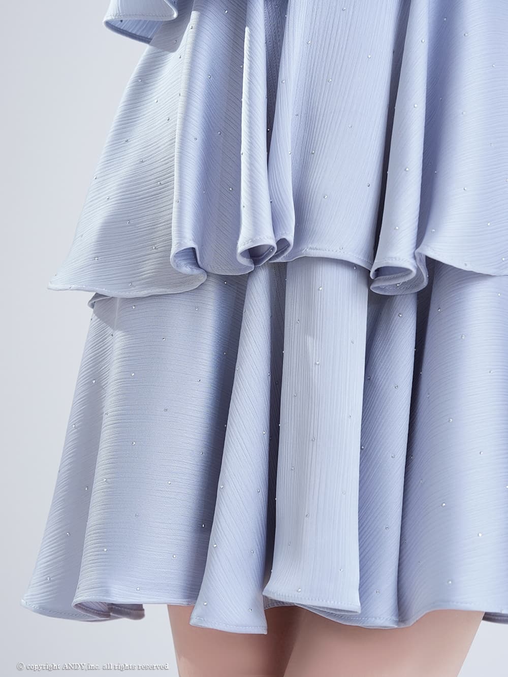 ドレス全体に散りばめられたストーンと揺れるフリルが目を惹くミニドレス