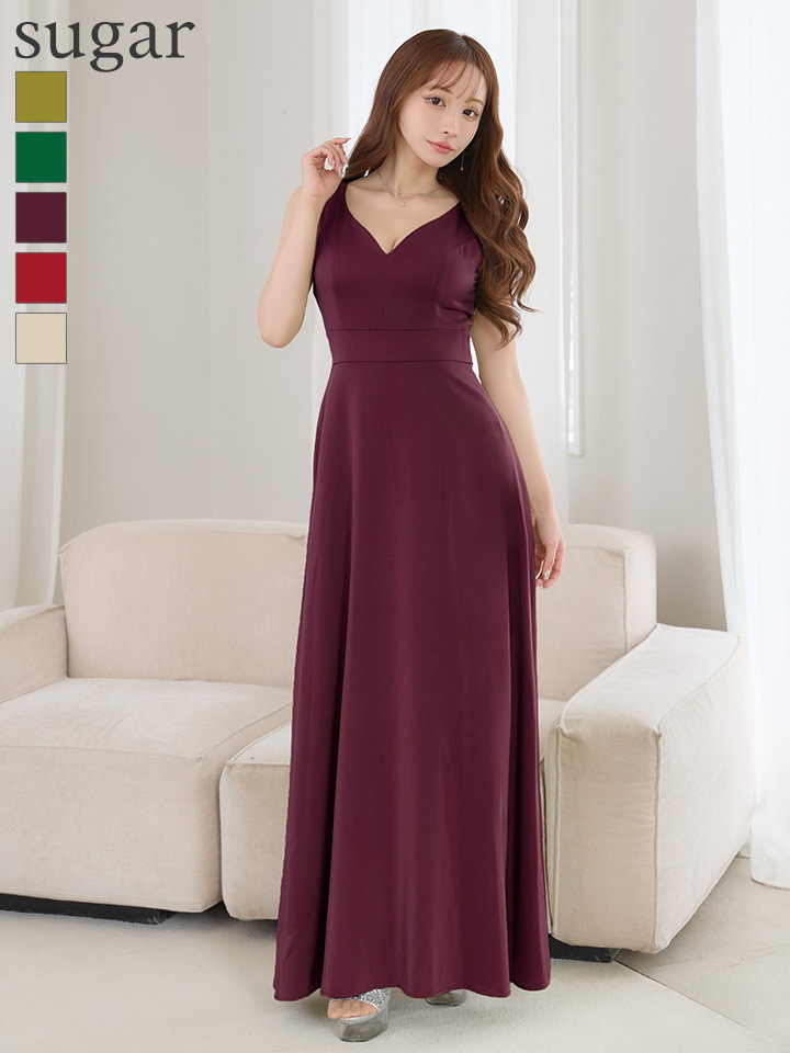 しっとりとした光沢感のワンカラーが上品なフレアロングドレス。