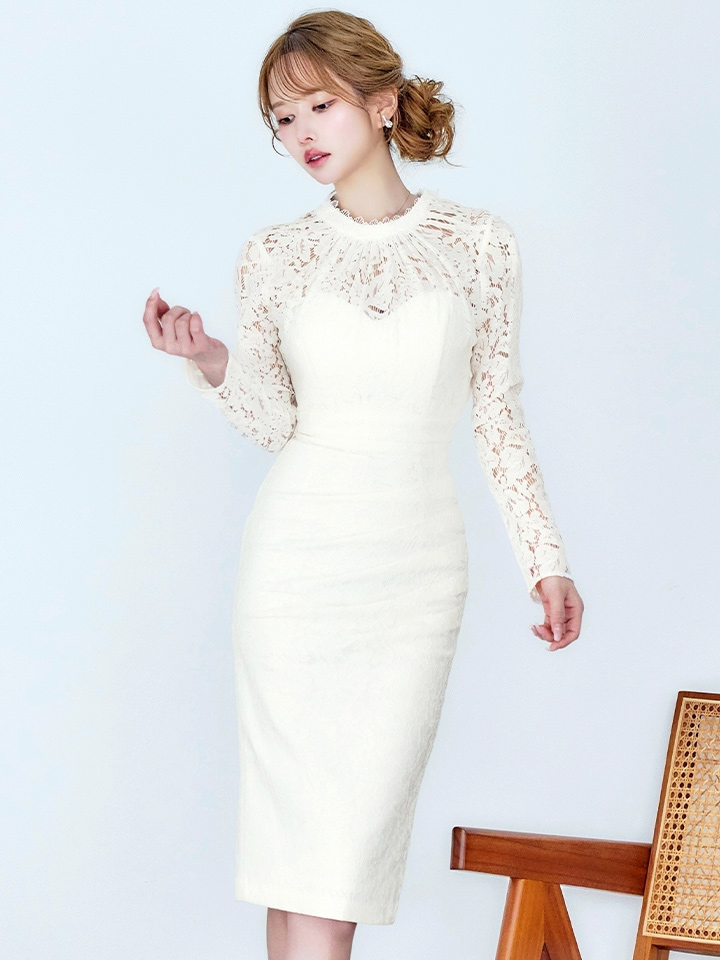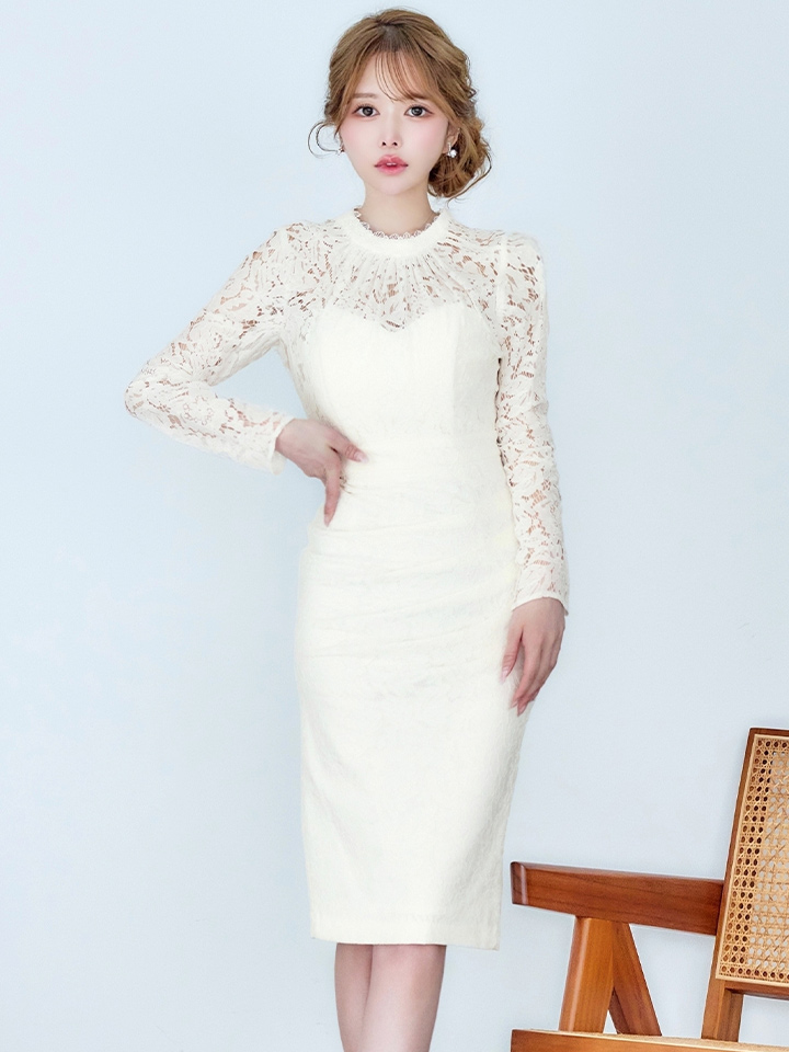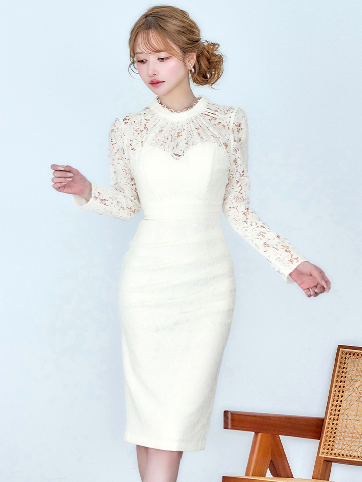 Lサイズあり【VANESSA HEART / ヴァネッサハート】【OF05】総レース/ ハイネック/ ロングスリーブ/ 袖あり/ タック/ 膝丈/ タイト/ ミディアムドレス/ キャバドレス [H60174H-IV-S2603]