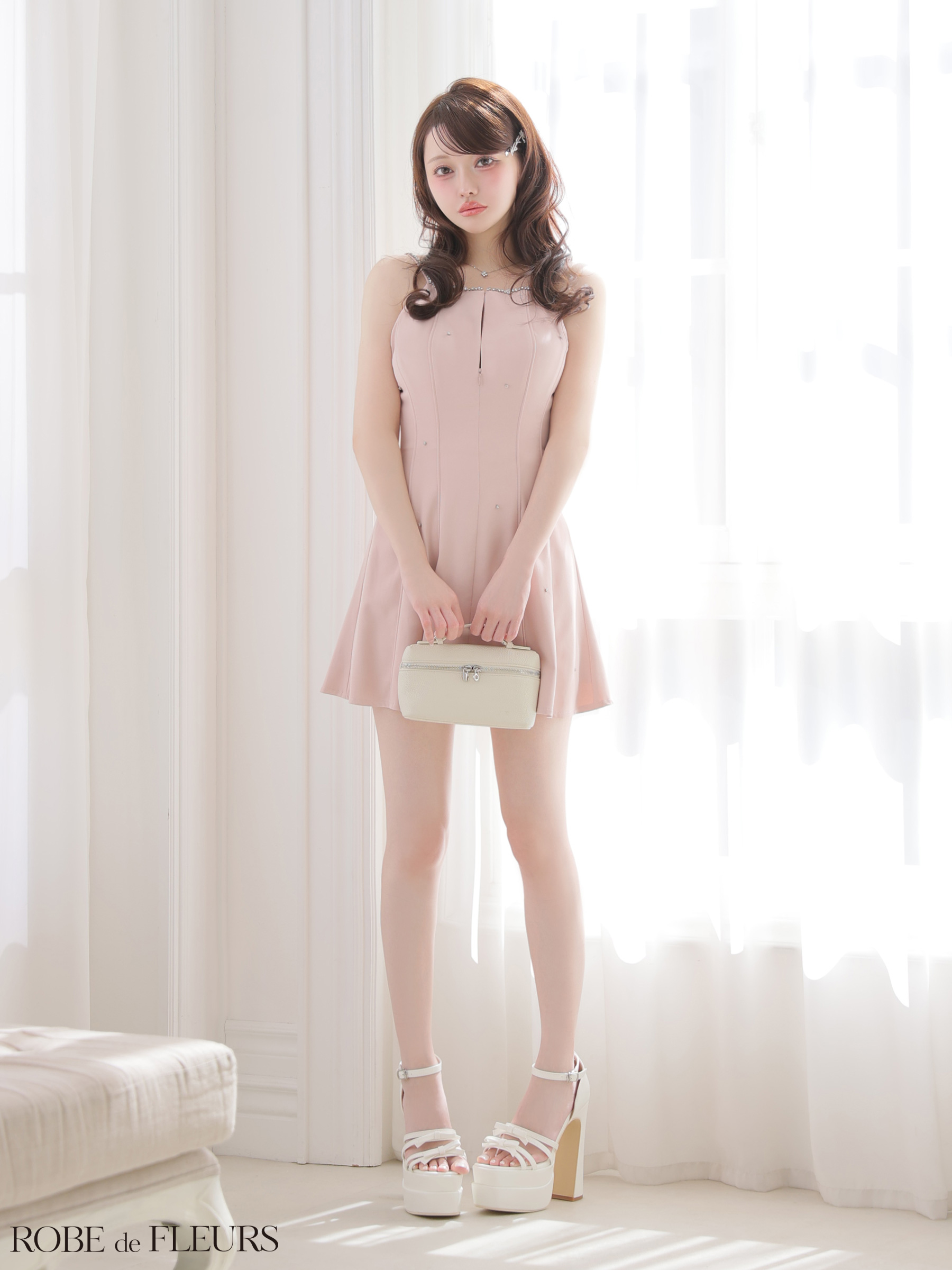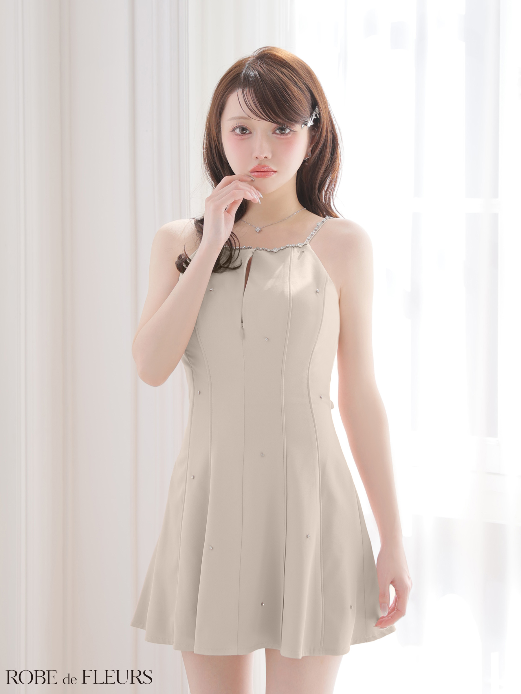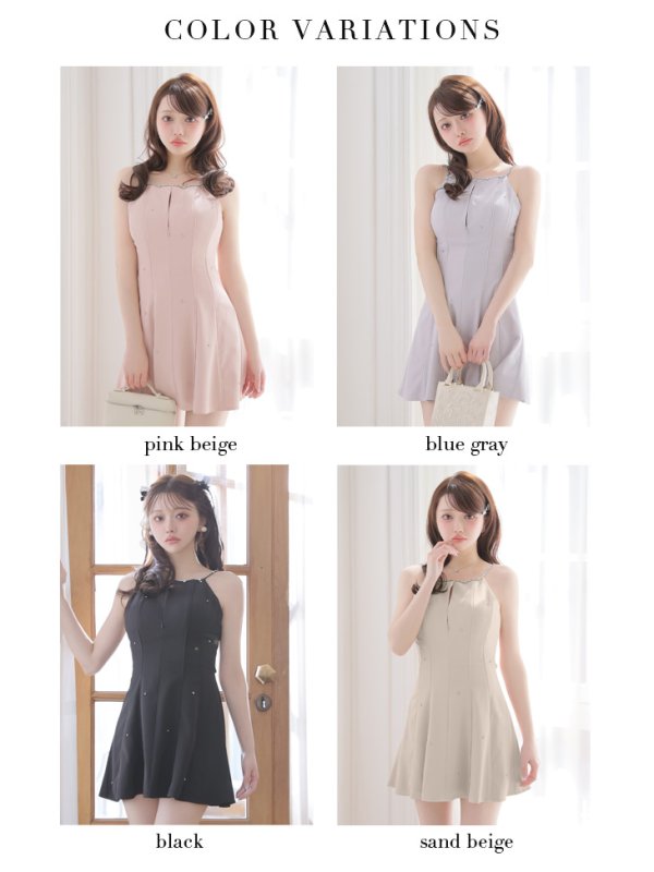 XSサイズあり【ROBE de FLEURS/ローブドフルール】バックリボン/ ビジュー/ キャミ/ ストレッチ/ フレア/ ミニドレス/ キャバドレス[OF08] [FM4174-sandBE-2603]