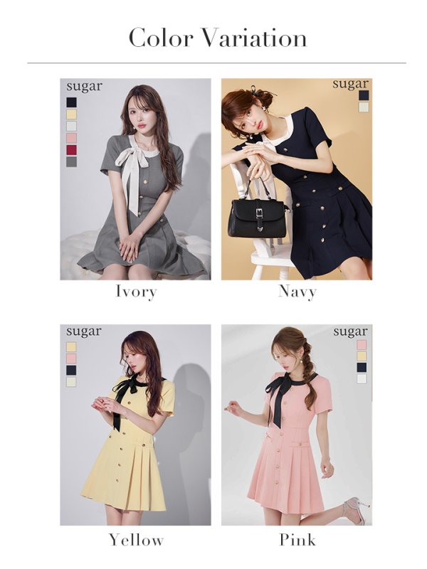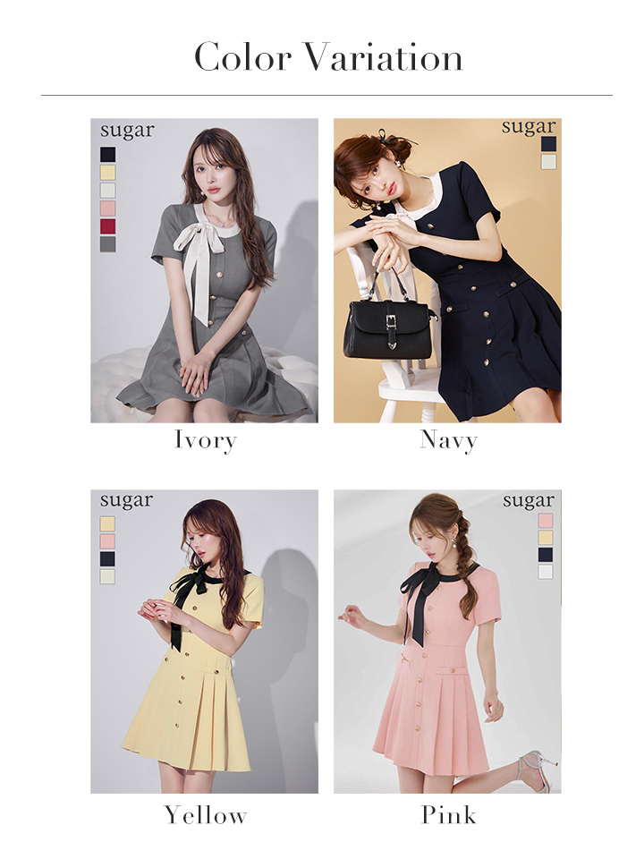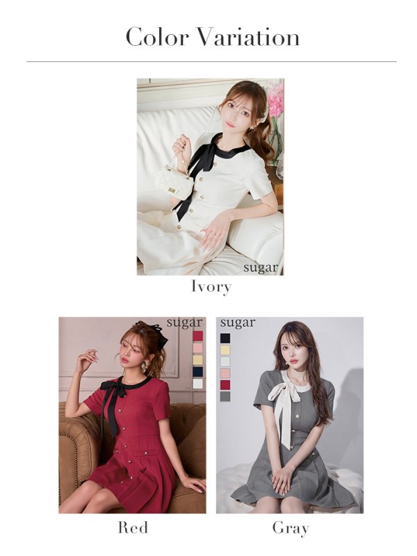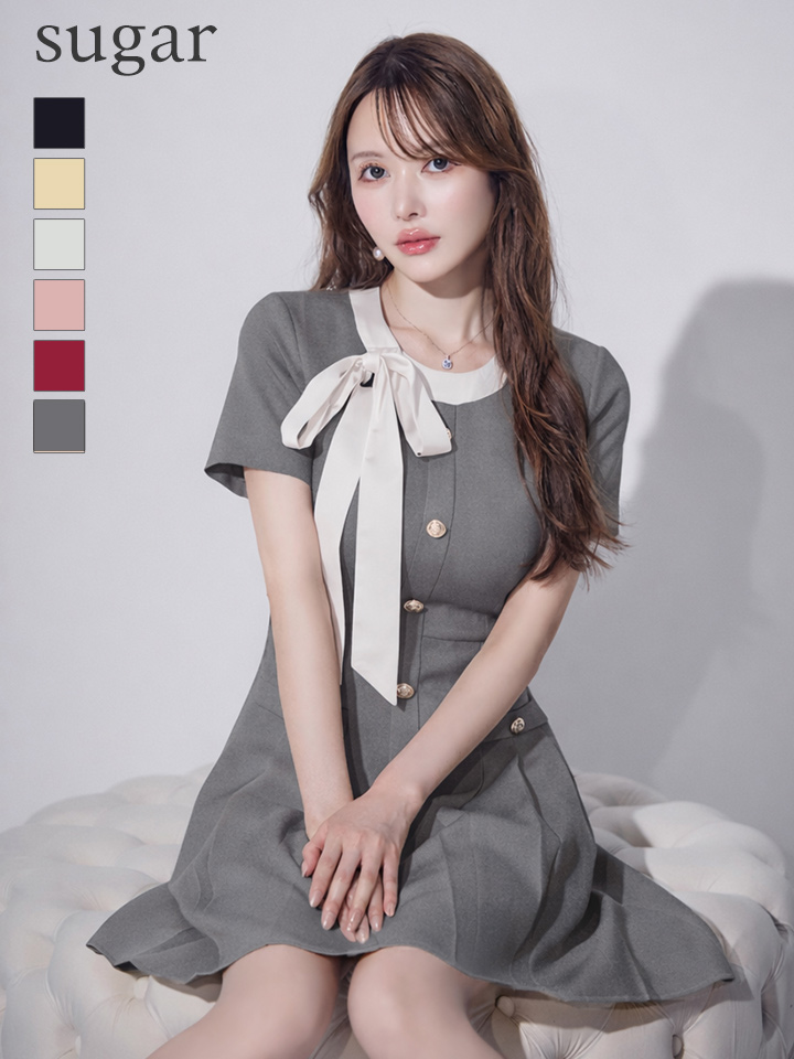 XS-Lサイズあり 【GINZA COUTURE/銀座クチュール】バイカラー/ リボン/ 半袖/ 袖あり/ プリーツ/ フレア/ Aライン/ ワンピース/ ミニドレス/ キャバドレス[OF2] [LKC24182-GY-S2603]