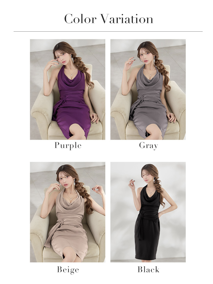 美しいドレープネックがデコルテを柔らかく包み込む、洗練されたホルターワンピース。