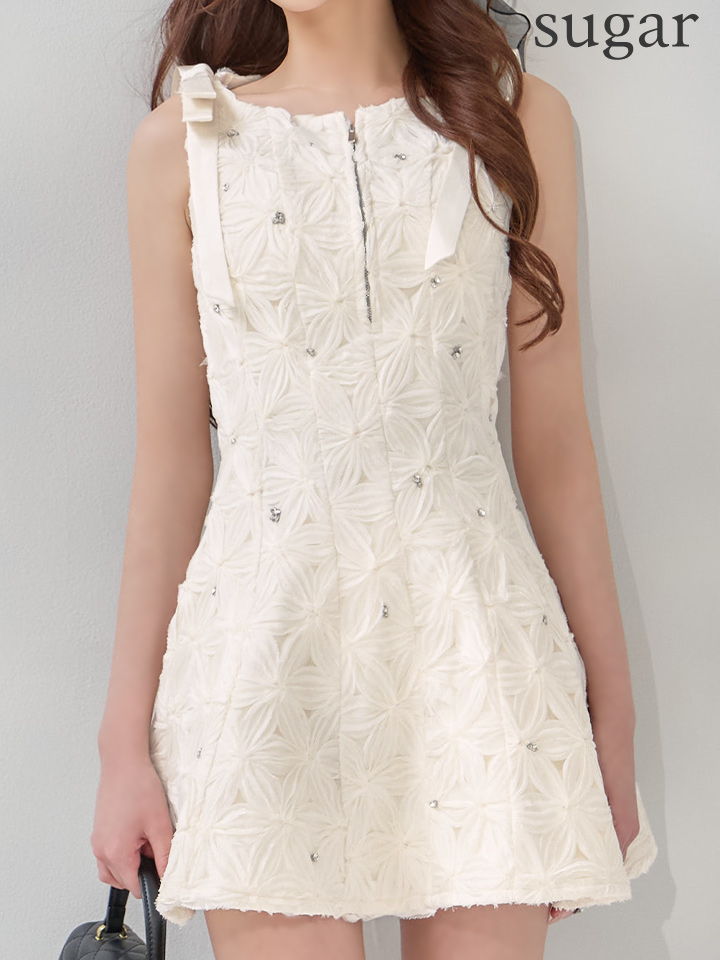 【さくら/関西コレクション着用】XSサイズあり【ROBE de FLEURS/ローブドフルール】フラッフィーフラワー/ ビジュー/ ショルダーリボン/ バストジップ/ ノースリーブ/ フレア/ Aライン/ ミニドレス/ キャバドレス[OF08]【一部予約商品/8月上旬発送予定】 [FM4360-B-S260410CC]