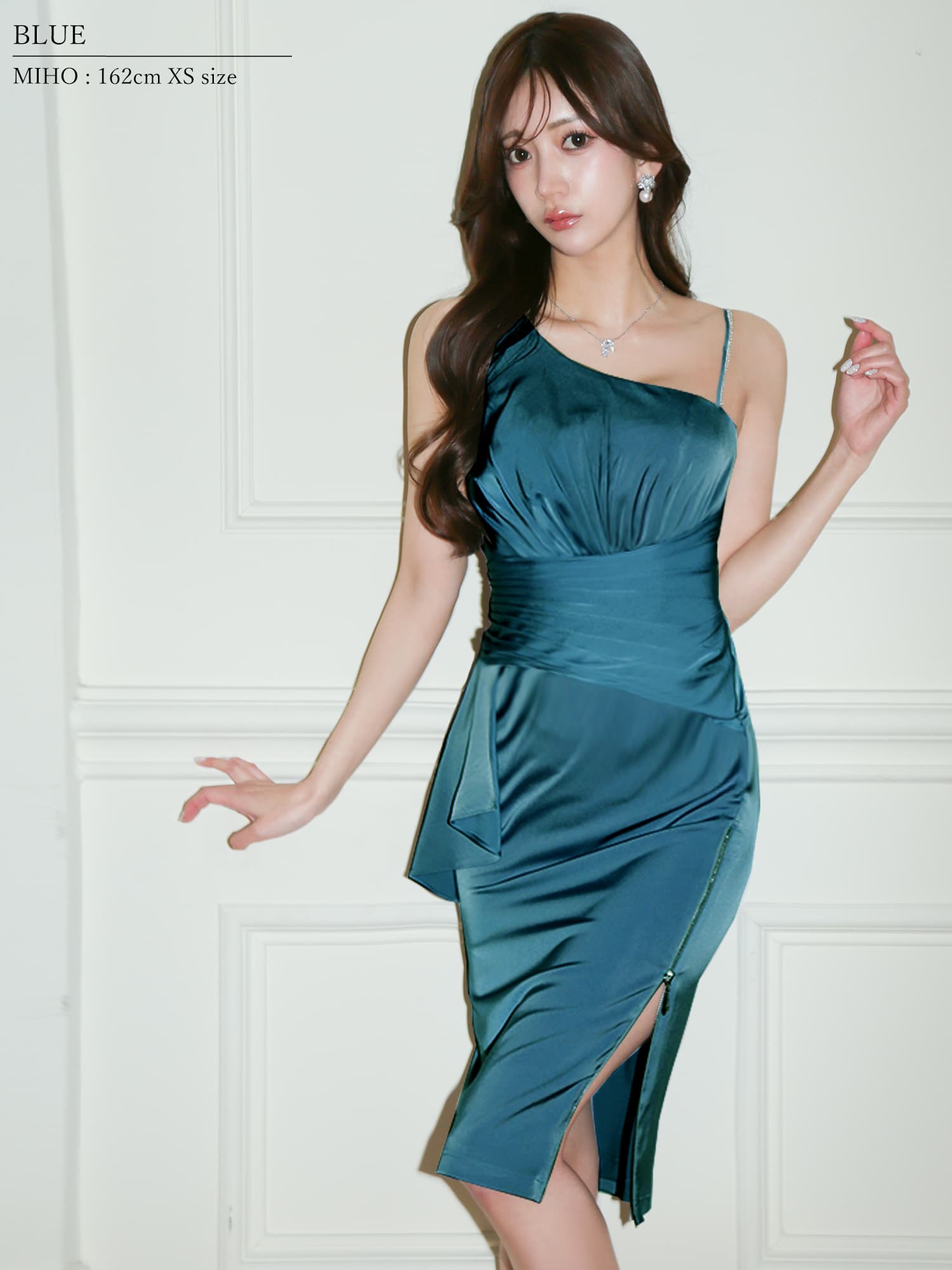 【予約商品/4月中旬-4月下旬発送予定】XSサイズあり【Veautt/ヴュート】アシンメトリーショルダー/ ウエストマーク/ フリル/ タック/ サイドファスナー/ タイト/ ミディアムドレス/ キャバドレス[OF05] [VT032606-W-2603]