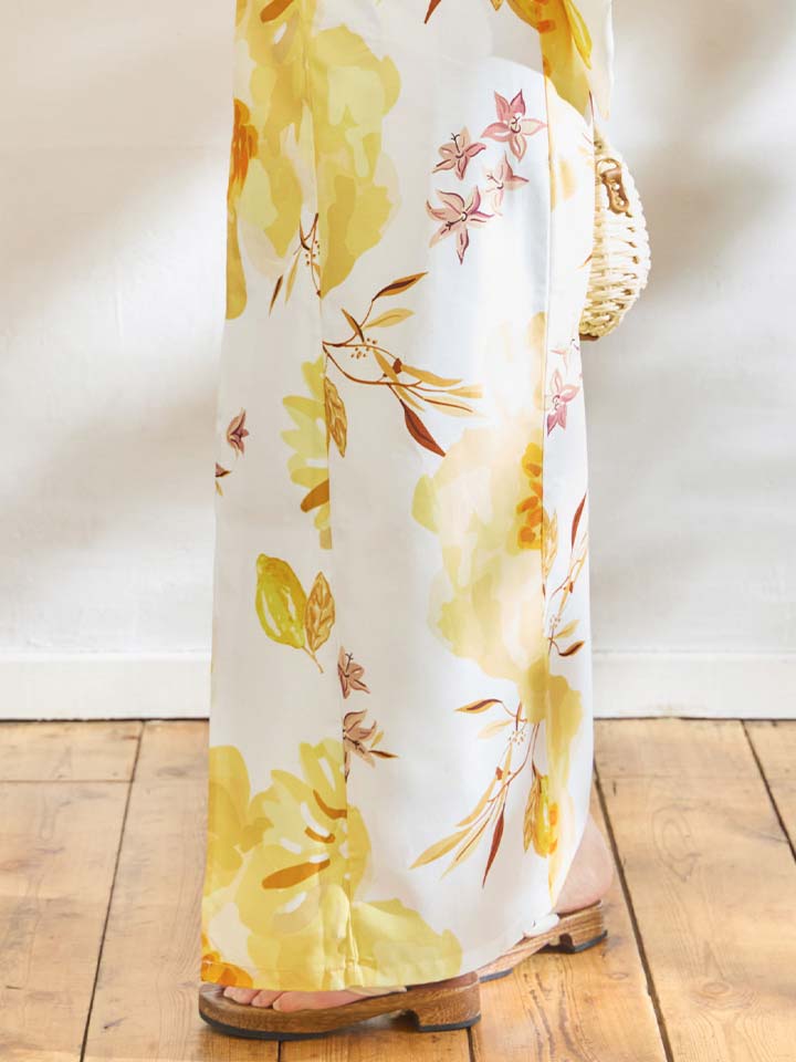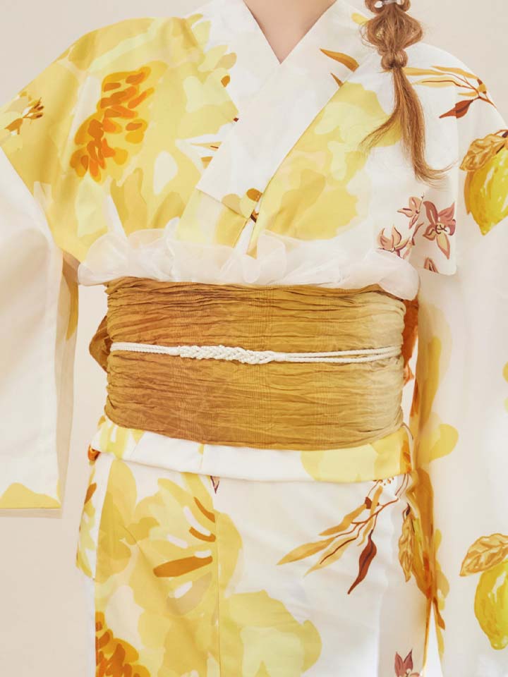 陽だまりのようなイエローの花々をあしらった、明るく華やかな浴衣。