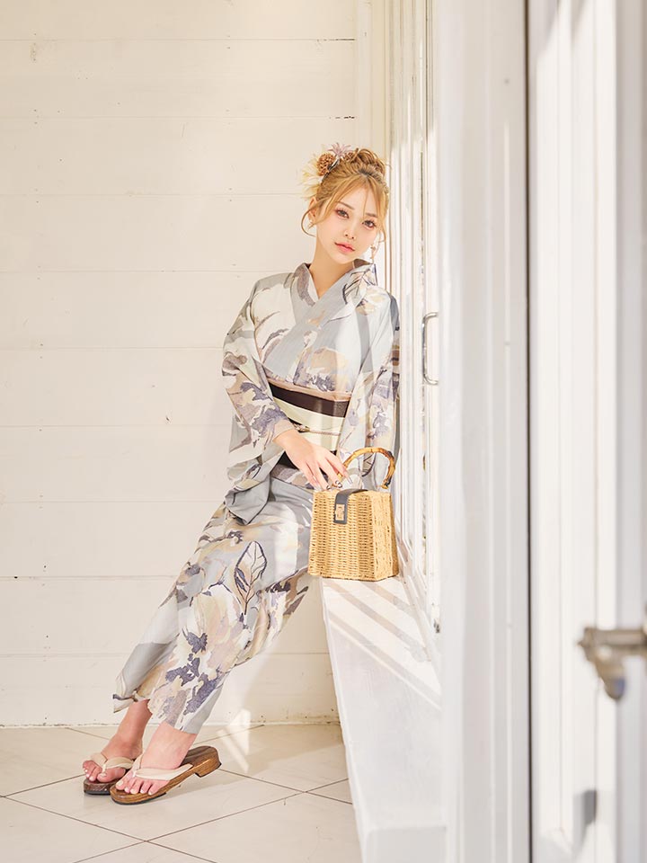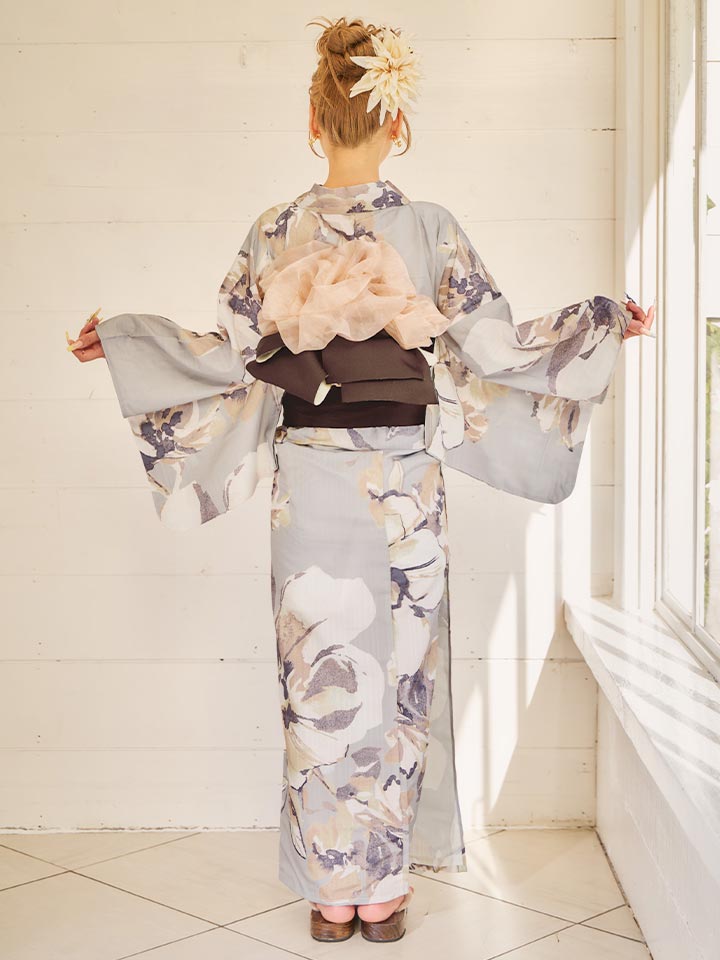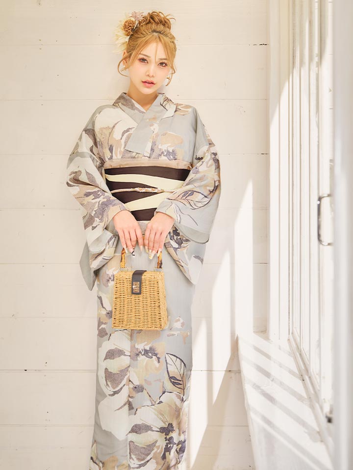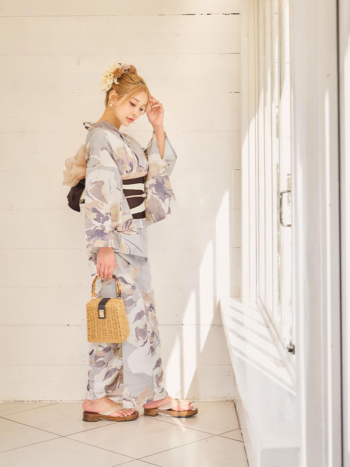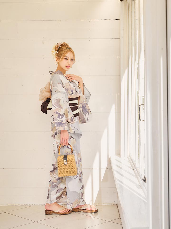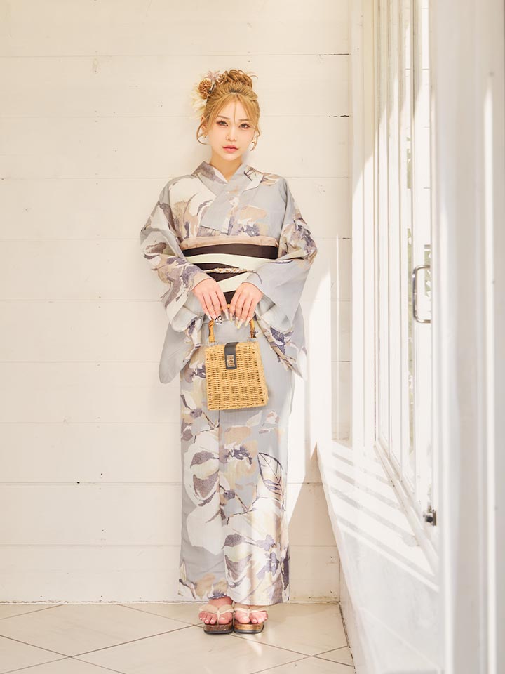 落ち着いたグレージュカラーで大人な雰囲気の浴衣。