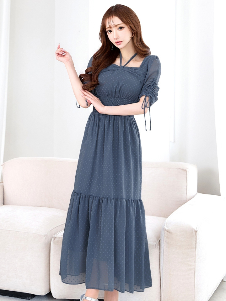 XLサイズあり【AMORA GRACE / アモーラグレース】 オケージョンドレス/ パーティードレス/ お呼ばれドレス/ ドット/ ハーフスリーブ/ ドロスト/ ギャザー/ フレア/ ミモレ丈/ ワンピース/ ミディアムドレス/ キャバドレス[OF05] [G60256HL-BLGY-S2603]
