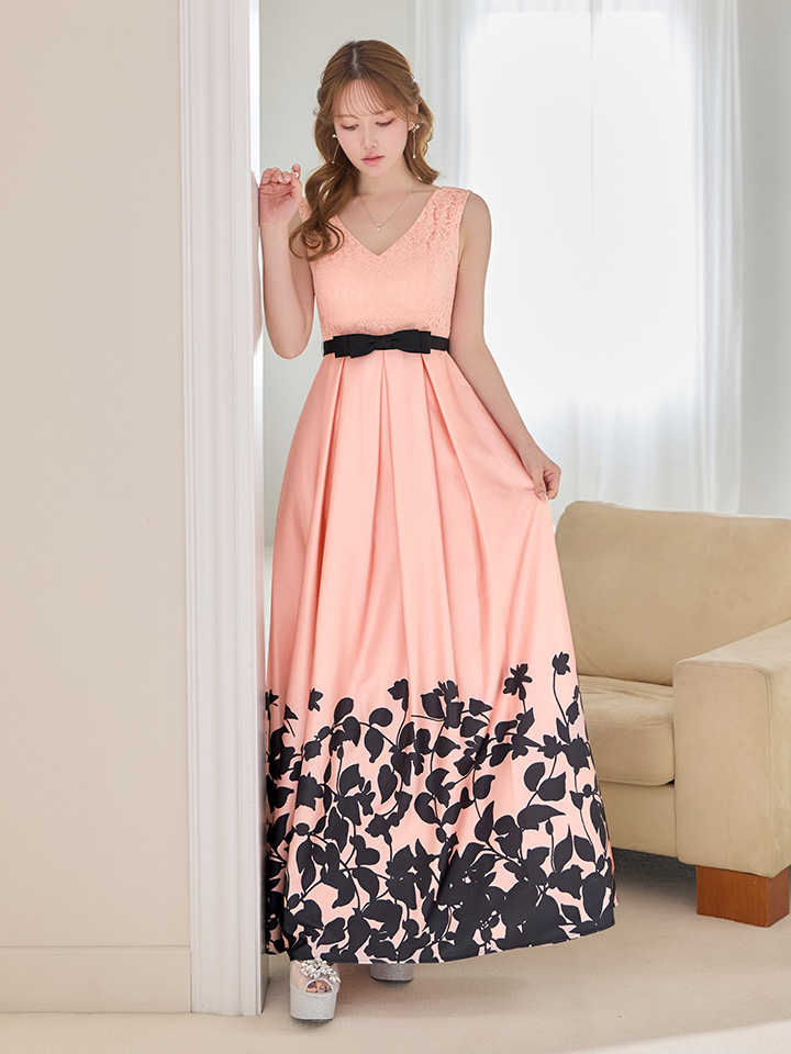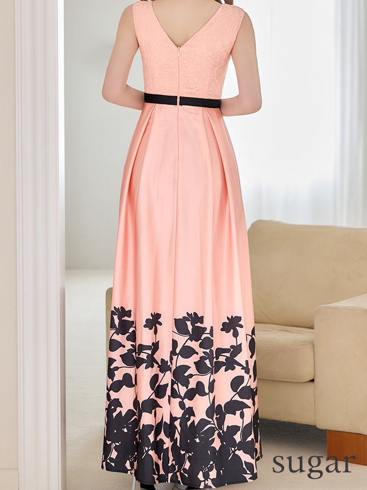XS-Lサイズあり【SETTAN/セッタン】ボタニカルプリント/ 異素材MIX/ バイカラー/ ハイウエスト切り替え/ レース/ サテン/ Vネック/ ノースリーブ/ タック/ フレア/ ワンピース/ ロングドレス/ キャバドレス long[OF2] [LKS26013-PxB-S260330]
