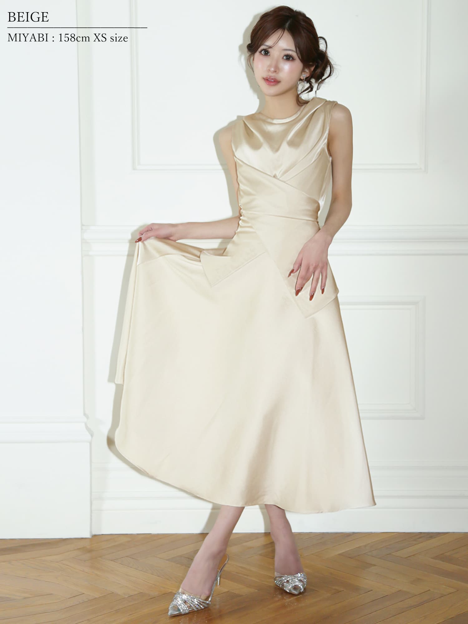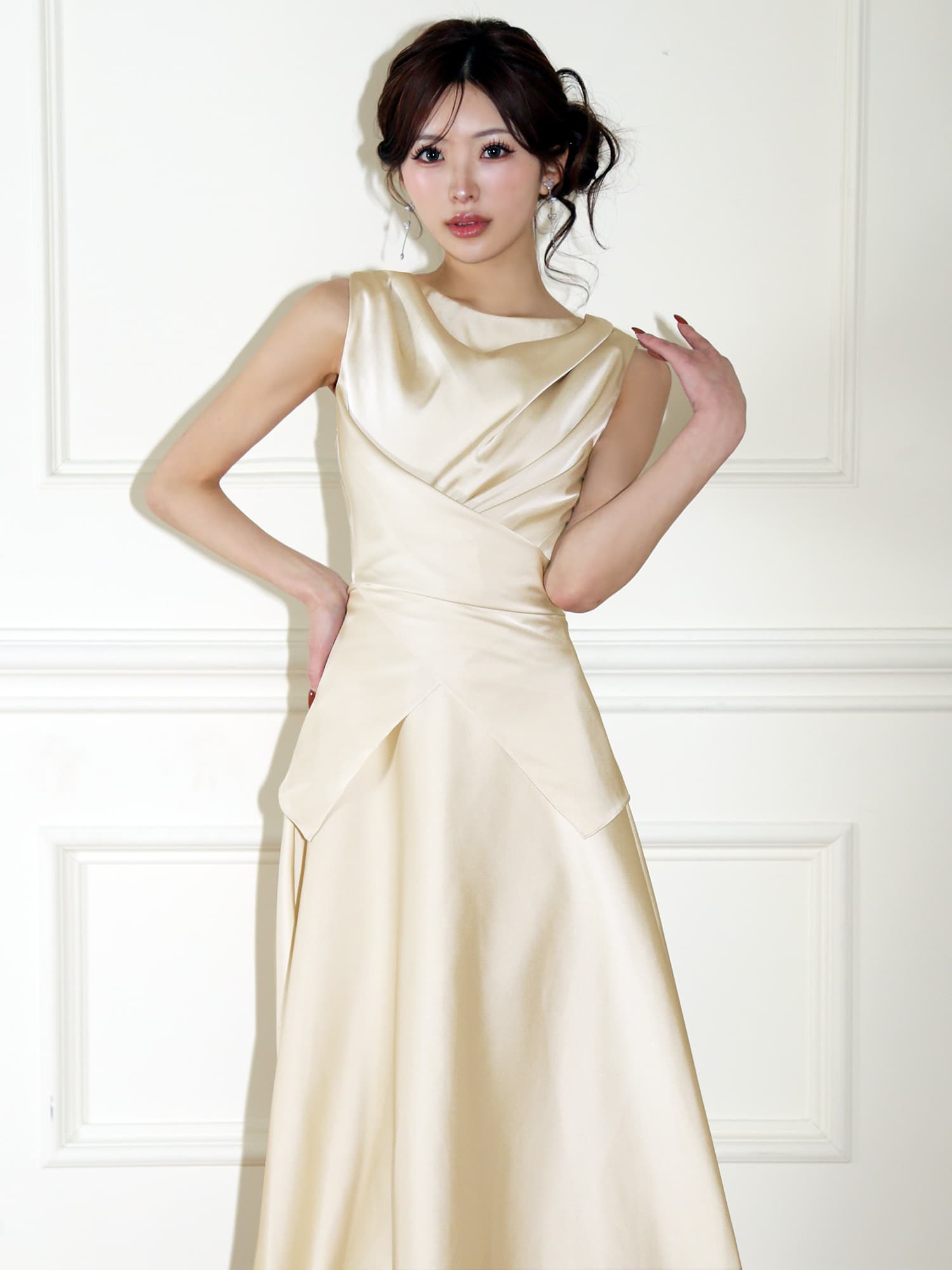 トップスはドレープデザインでデコルテを美しく引き立て、女性らしい柔らかさを演出。