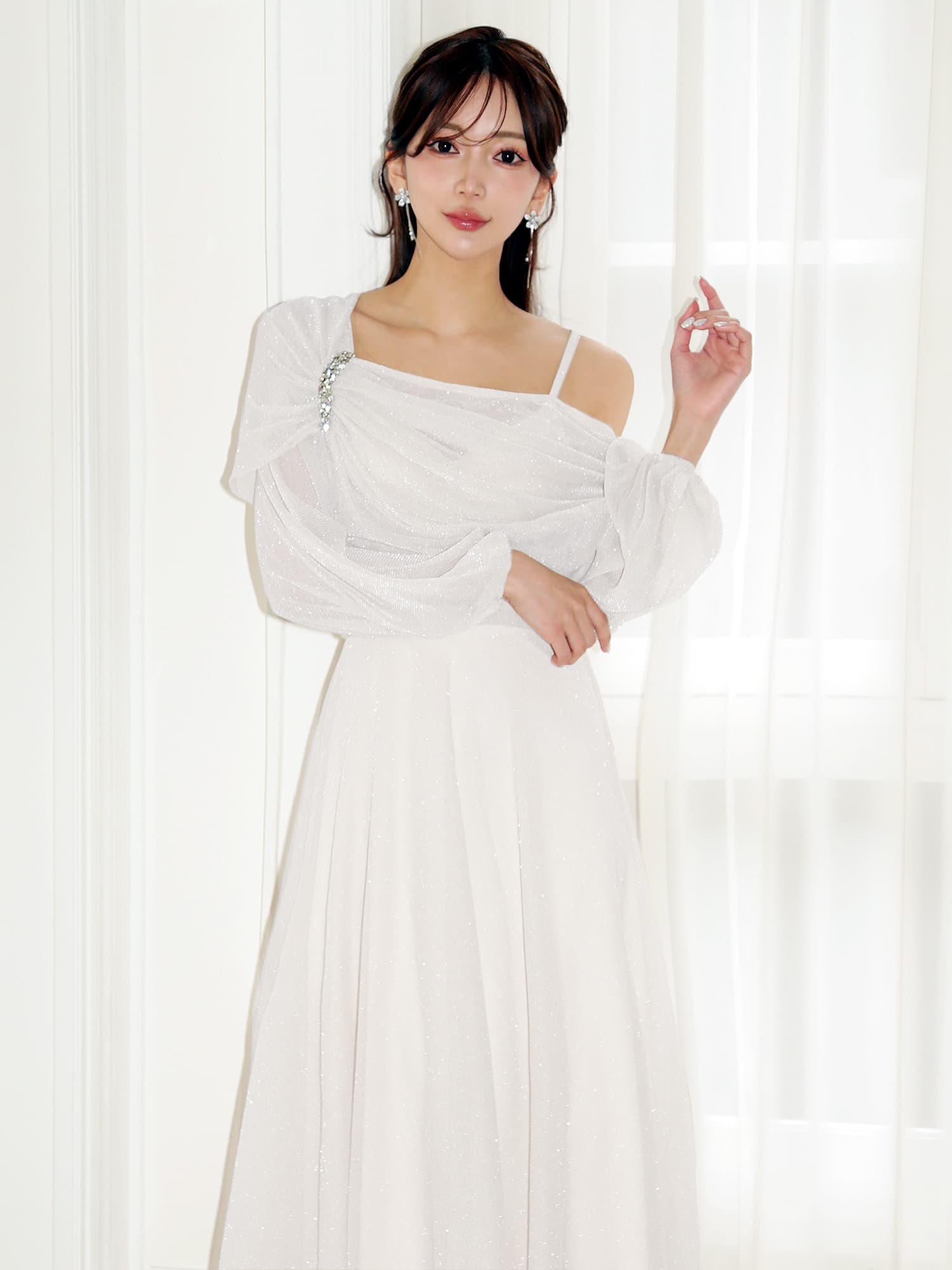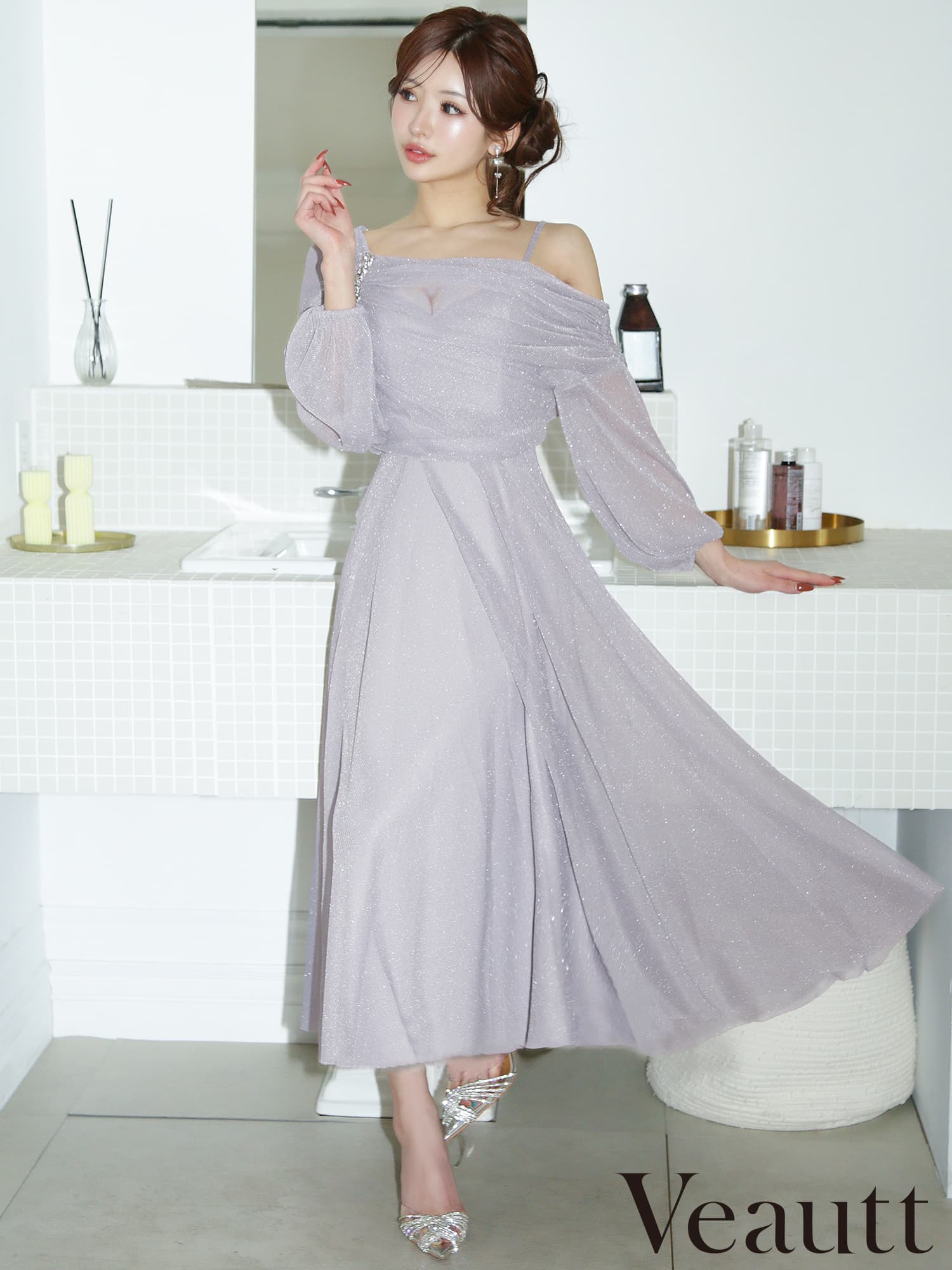 柔らかな透け感ときらめきが魅力の、エレガントなロングドレス。