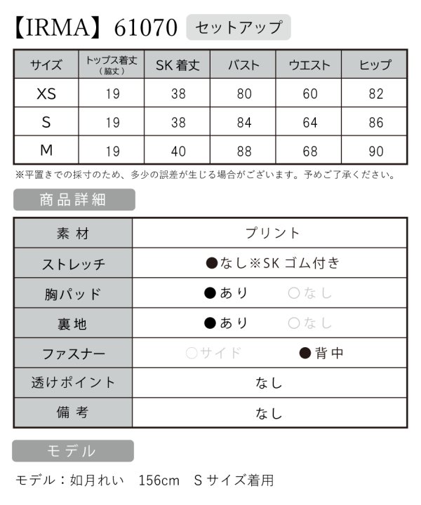 B:84 / W:64 / H:86 [着丈]トップス(脇下):約19cm スカート丈:約38cm |