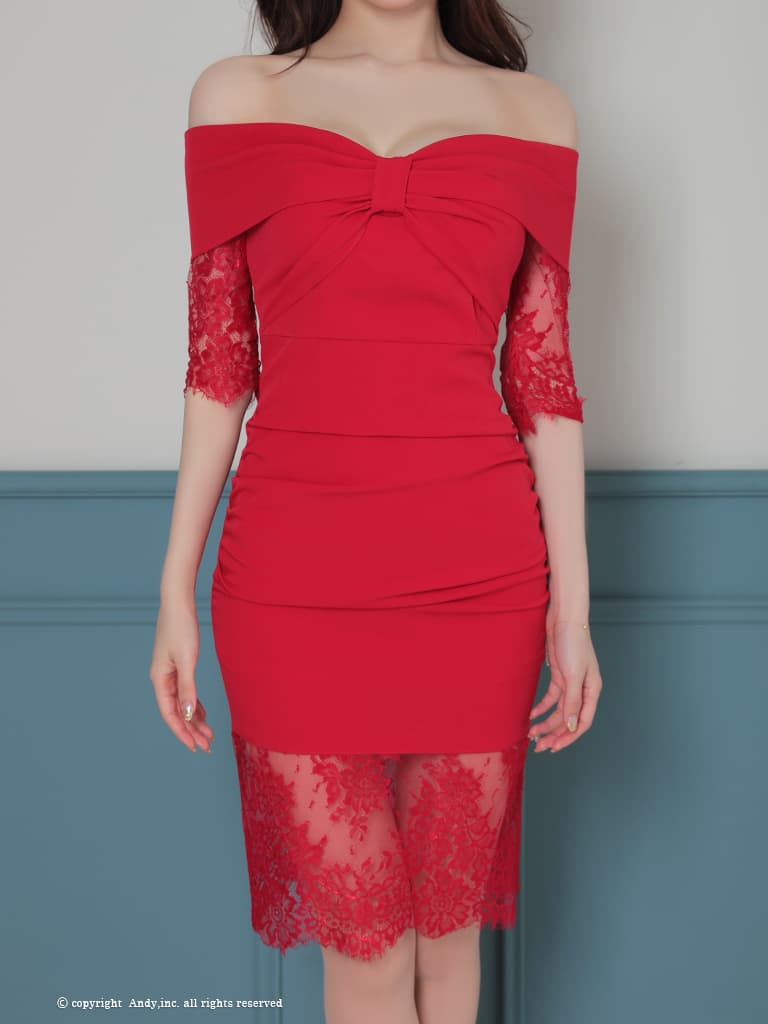 【ANDY/アンディ】オフショル/ フラワーレース/ ハーフスリーブ/ シアー/ バストギャザー/ 異素材切り替え/ タイト/ ミディアムドレス/ キャバドレス[OF05] [ON2847-R-2603]