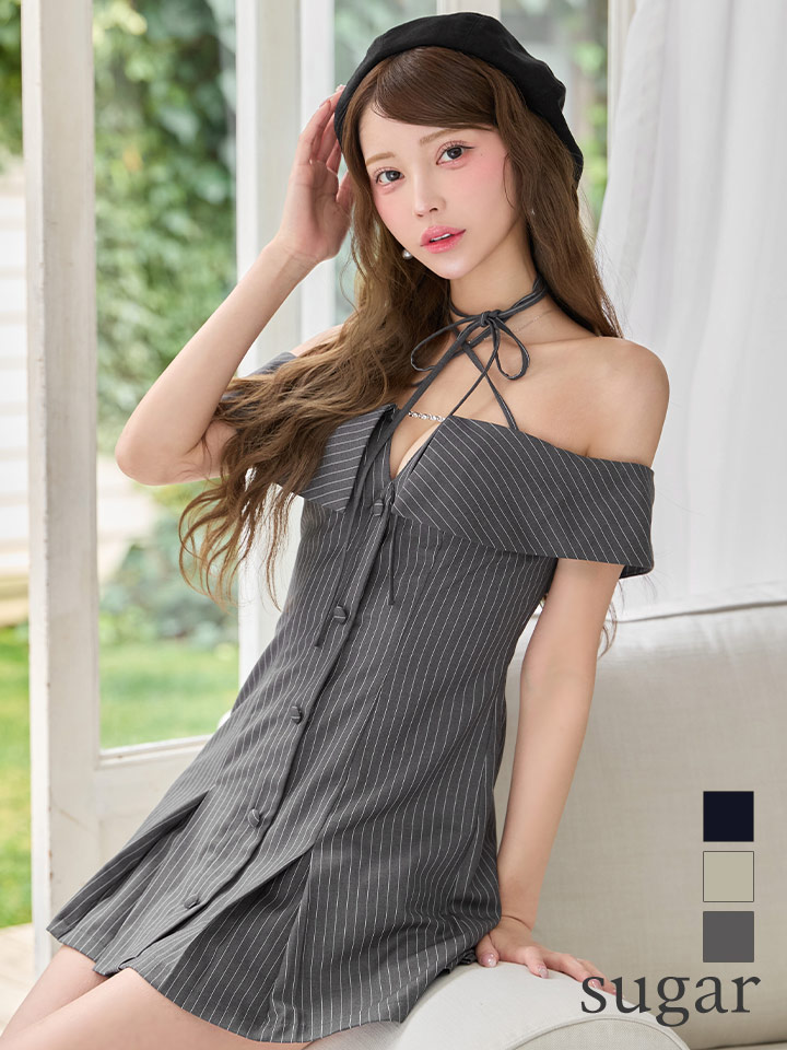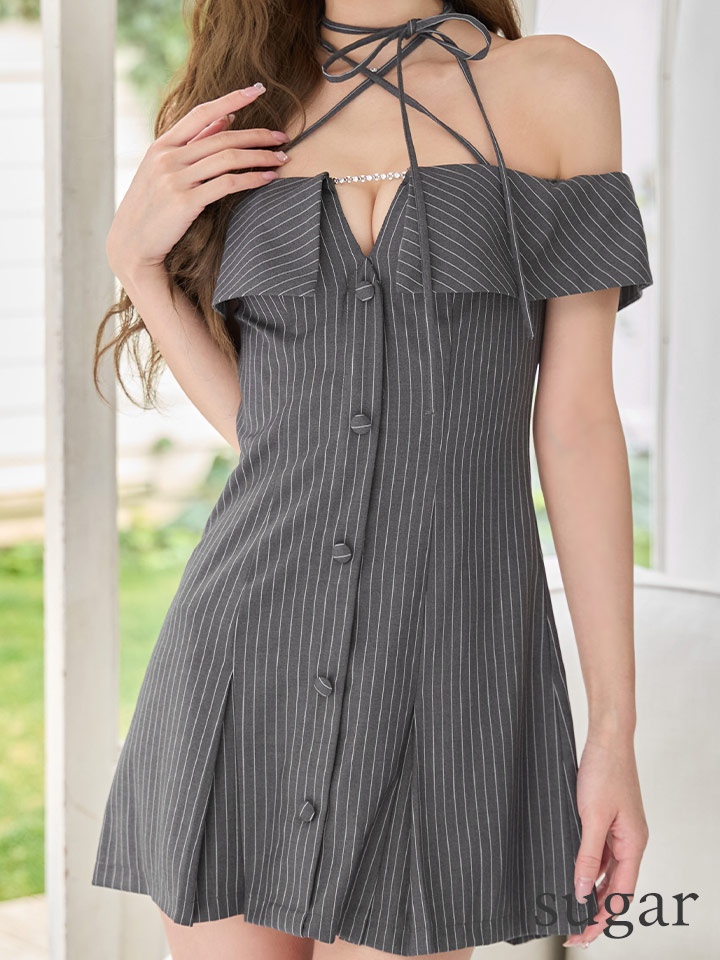 XSサイズあり【ANGEL R/エンジェルアール】クロスネック/ ストライプ/ ビジューチャーム/ ボタン/ プリーツ/ フレア/ マイクロミニドレス/ キャバドレス[OF2] [AR25347-GY-S260403]