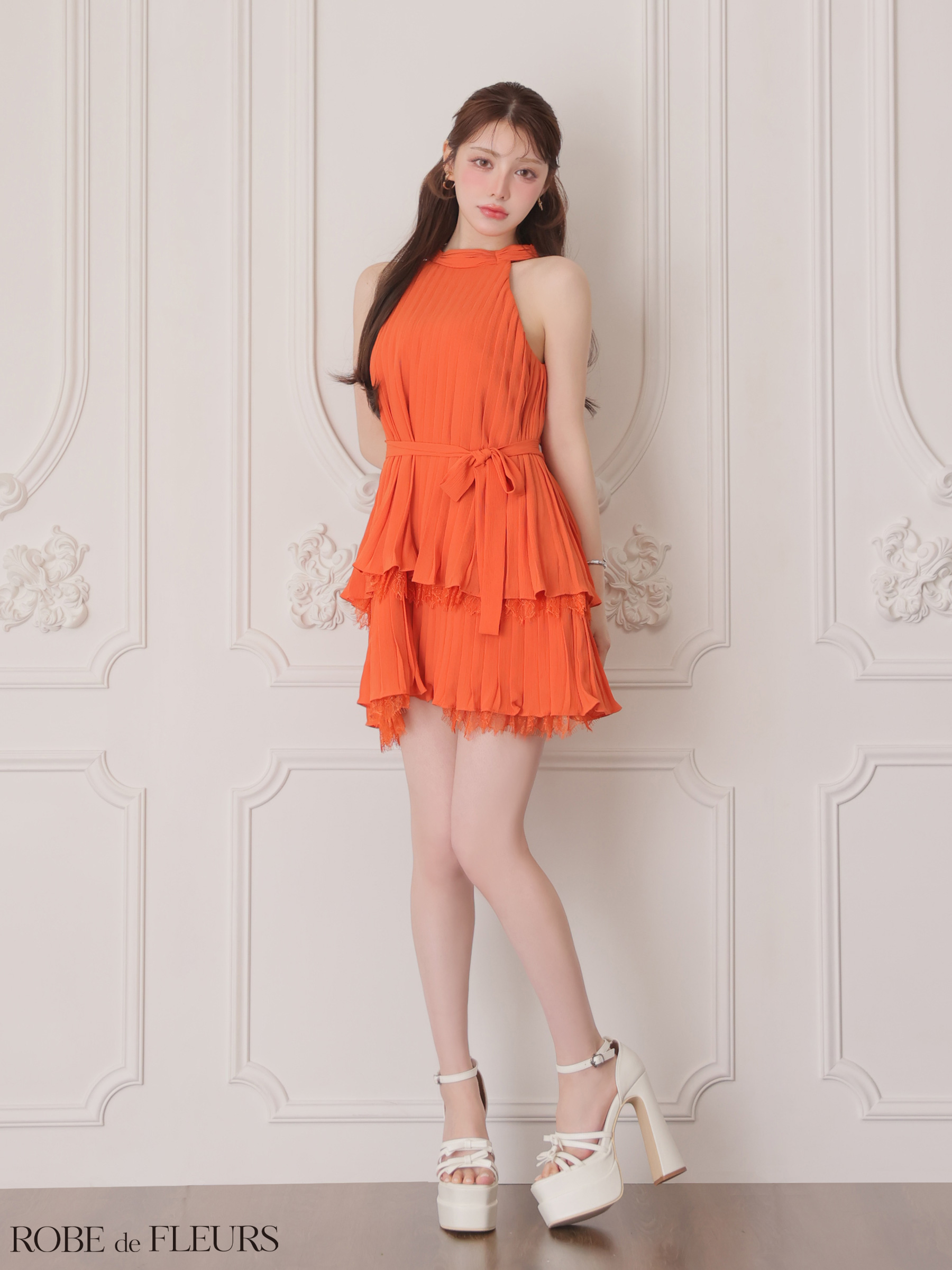【予約商品/5月上旬発送予定】XSサイズあり【ROBE de FLEURS/ローブドフルール】ホルター/ リボン/ レースプリーツ/ ラメシフォン/ ティアード/ 2段フリル/ フレア/ ミニドレス/ キャバドレス[OF08] [FM4614-GYGE-2604]