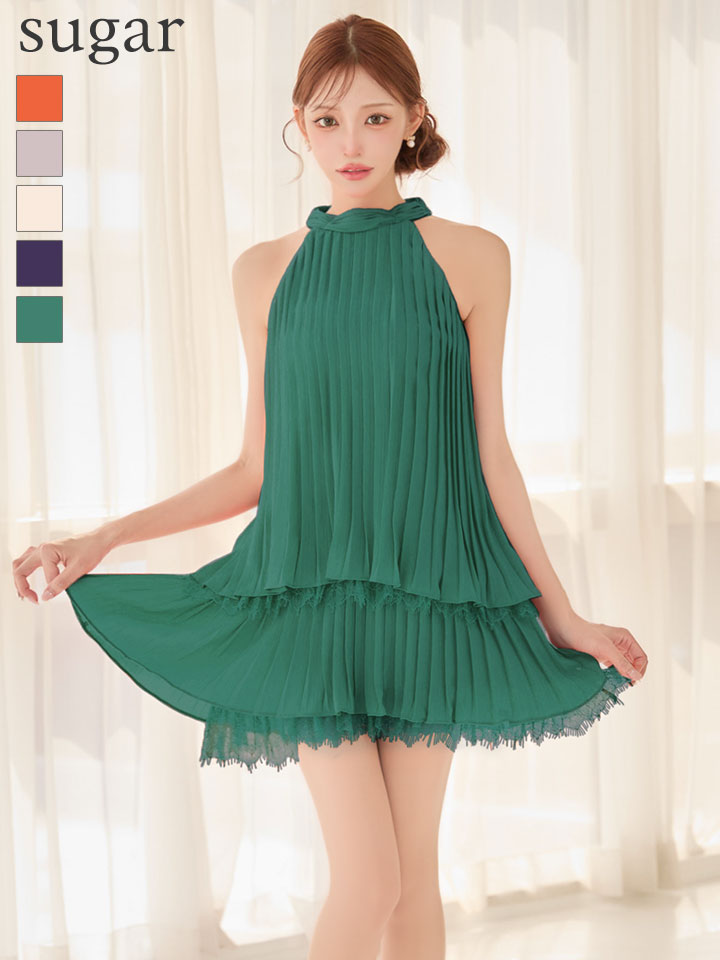 【予約商品/5月上旬発送予定】XSサイズあり【ROBE de FLEURS/ローブドフルール】ホルター/ リボン/ レースプリーツ/ ラメシフォン/ ティアード/ 2段フリル/ フレア/ ミニドレス/ キャバドレス[OF08] [FM4614-PL-S260406]