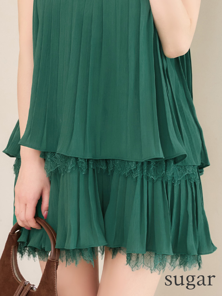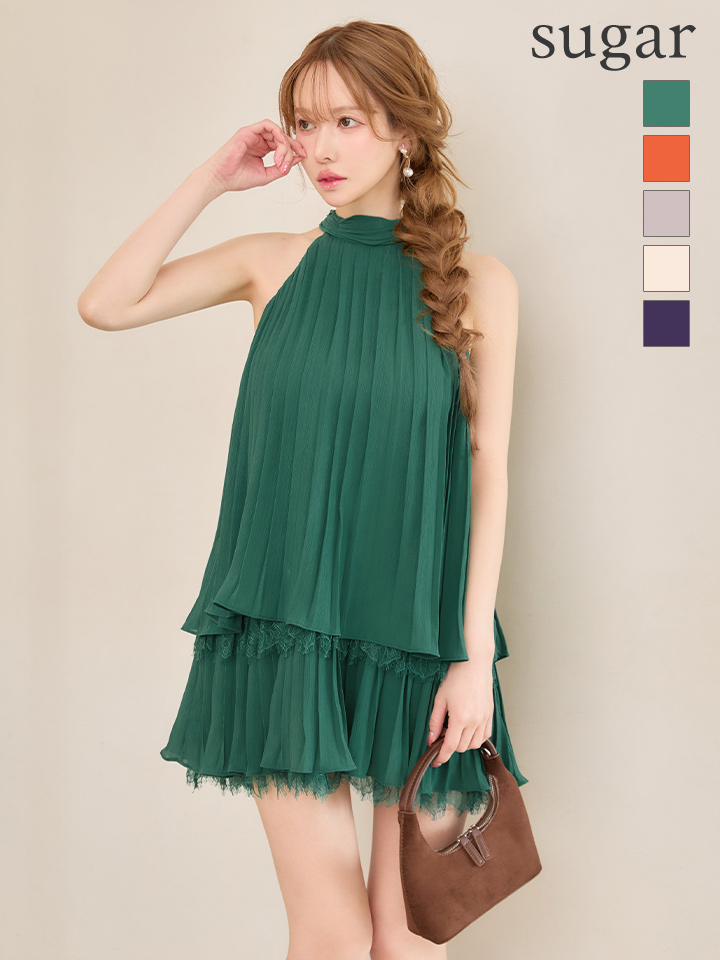 【予約商品/5月上旬発送予定】XSサイズあり【ROBE de FLEURS/ローブドフルール】ホルター/ リボン/ レースプリーツ/ ラメシフォン/ ティアード/ 2段フリル/ フレア/ ミニドレス/ キャバドレス[OF08] [FM4614-GR-S260406-1]
