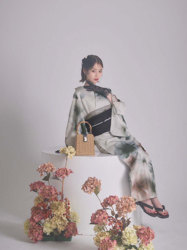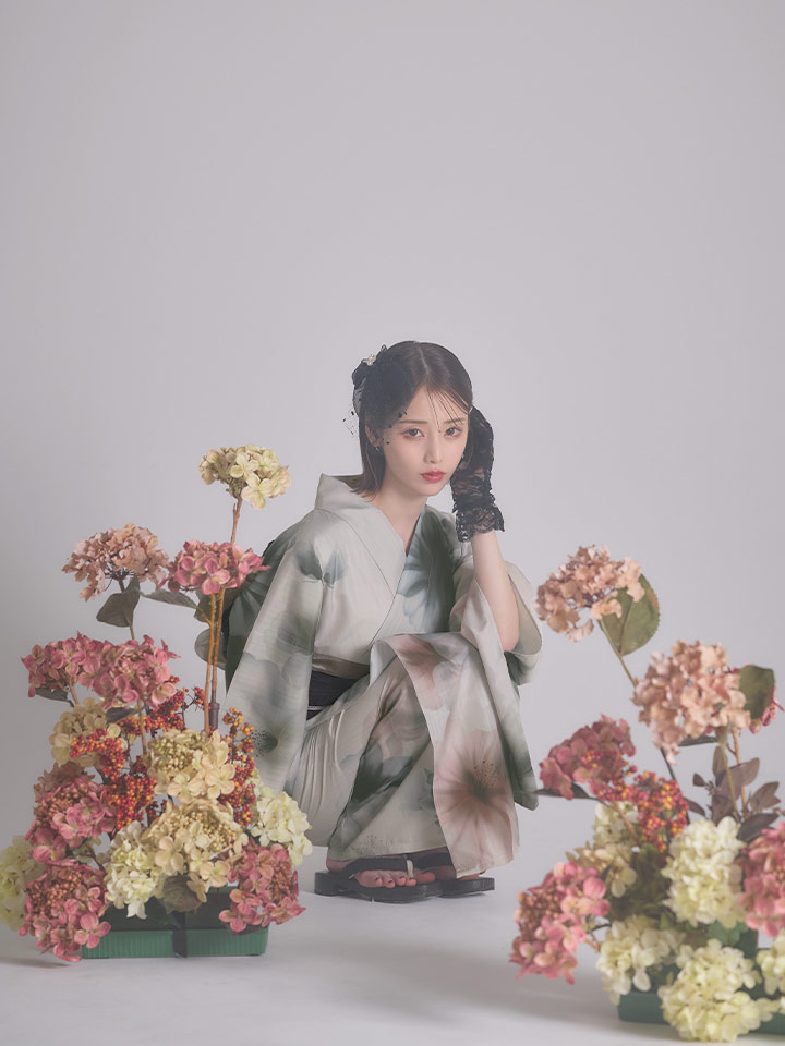 水彩画のような繊細な花々をあしらった「凛とした」一着。
