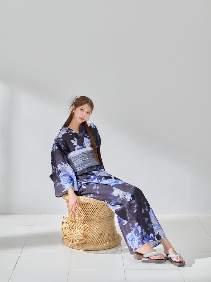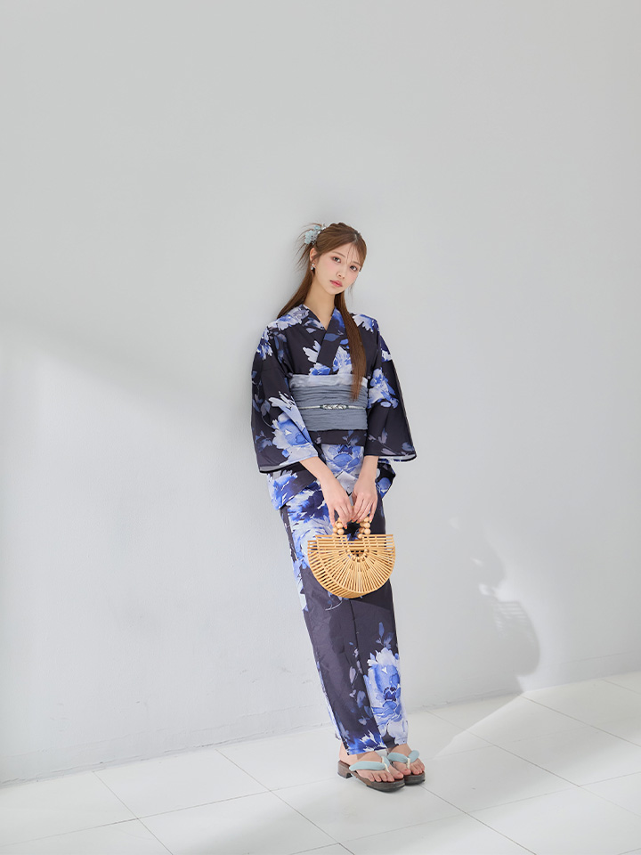 ネイビー地に映える牡丹の柄が美しい浴衣