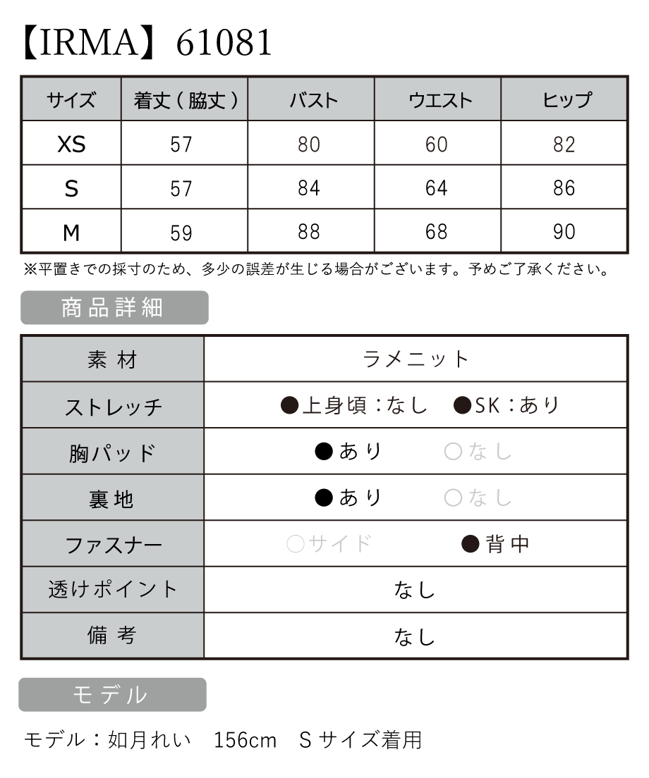 B:80 / W:60 / H:82 [着丈](脇下)約57cm |