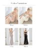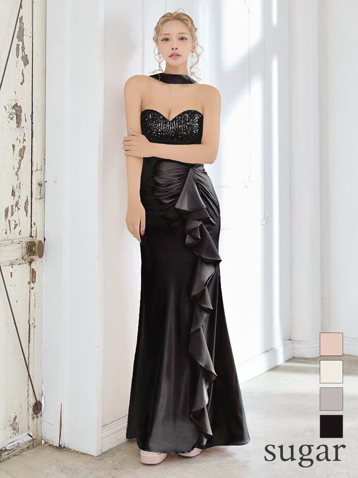 煌めくスパンコールビスチェと艶やかなサテンスカートを組み合わせた、上品で華やかなロングドレス。