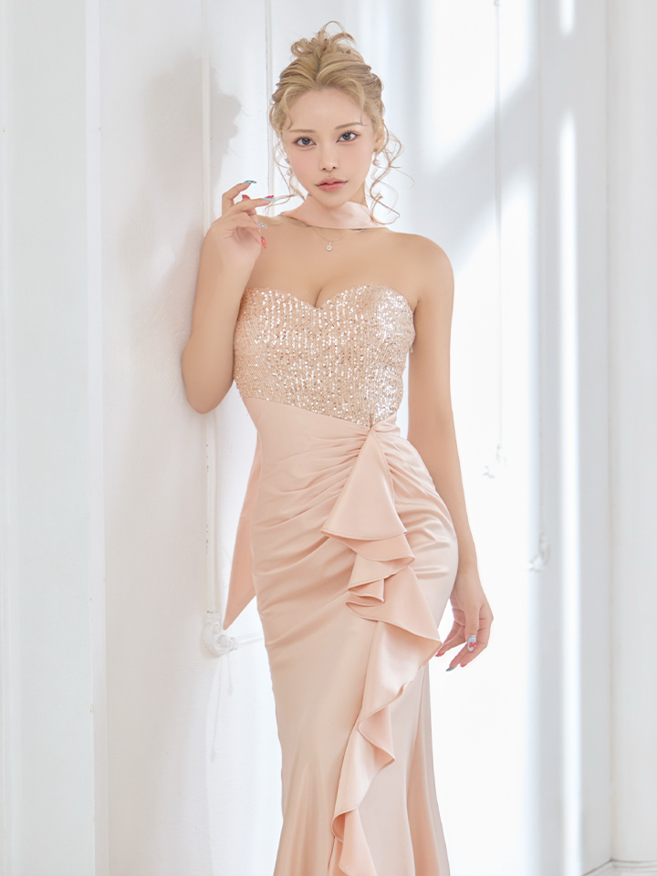 【ANGEL R/エンジェルアール】ベアトップ/ チョーカー/ フロントスパンコール/ フリル/ マーメイドライン/ 2way/ ストレッチ/ タイト/ ワンピース/ ロングドレス/ キャバドレス long[OF2] [AR26821-BE-S260407]