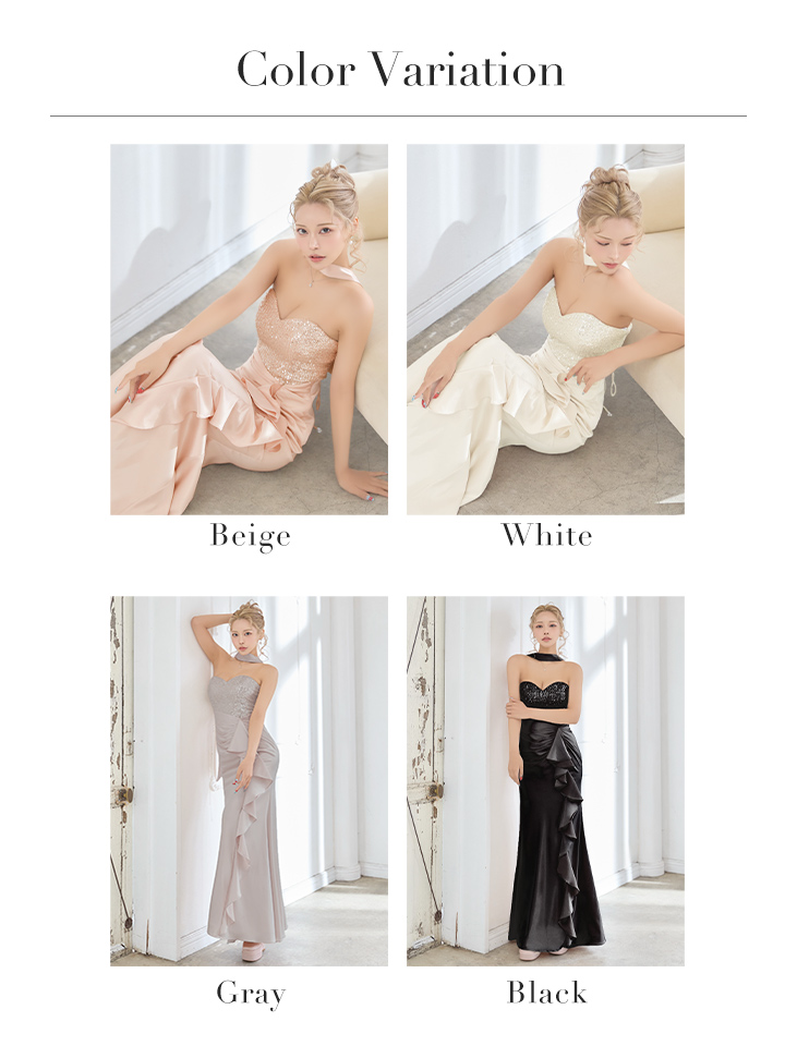 ボディラインに沿う美しいシルエットと、サイドのフリルデザインが女性らしさを一層引き立てます。