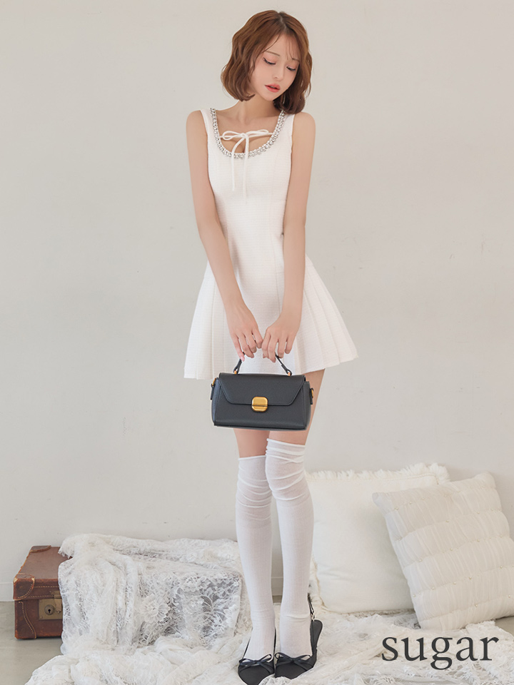 胸元のリボンとビジューラインが上品さの中にキュートな要素をプラス。
