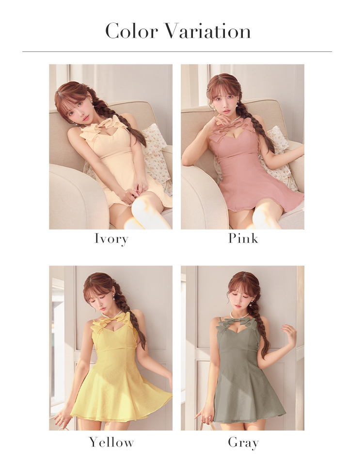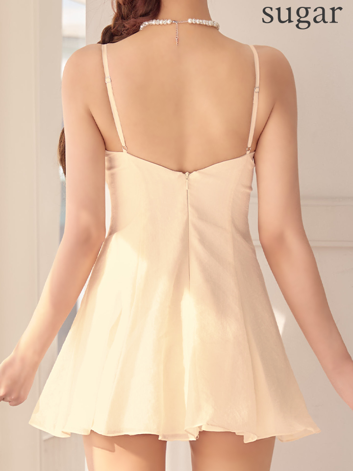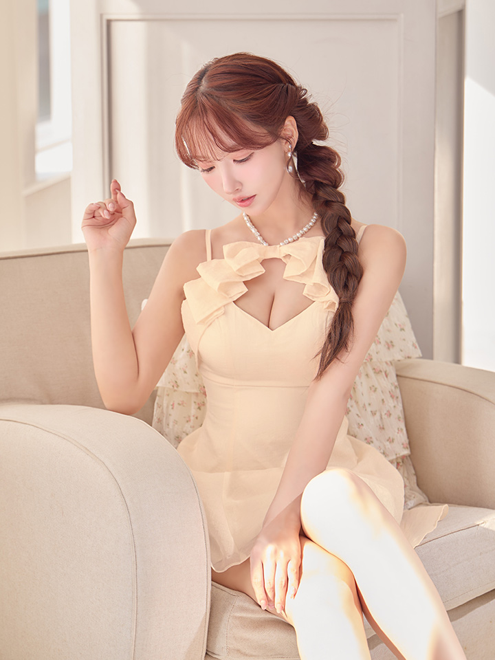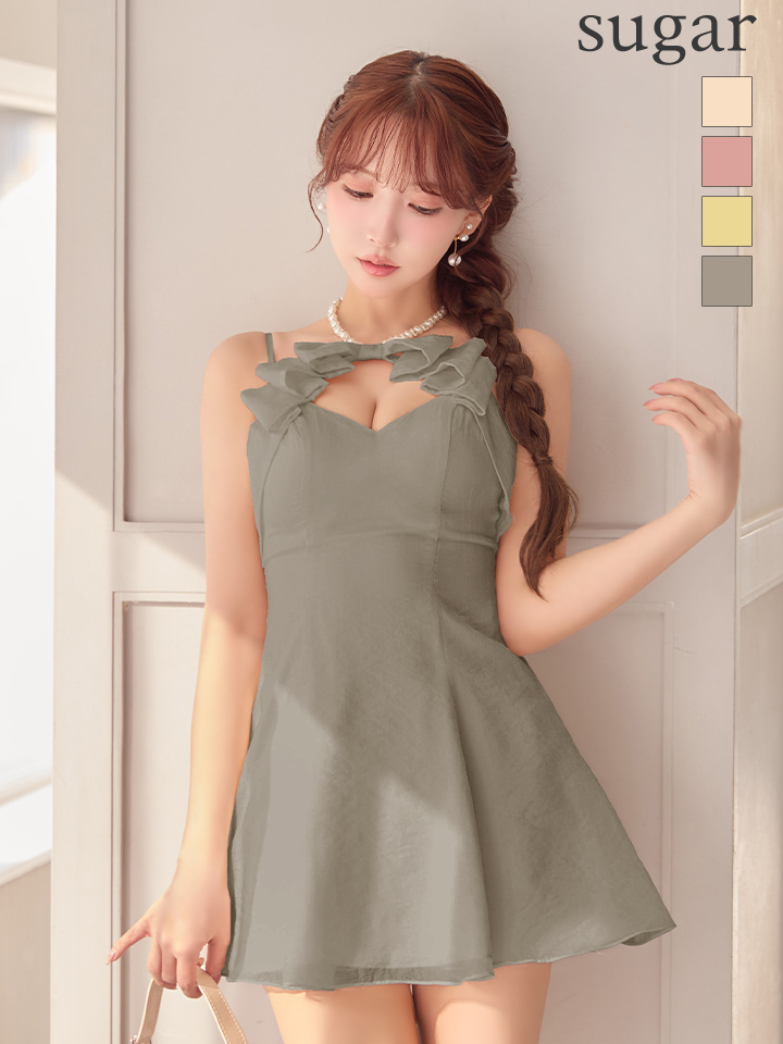 胸元のカッティングとリボンの組み合わせが、上品な抜け感と可愛らしさを演出。