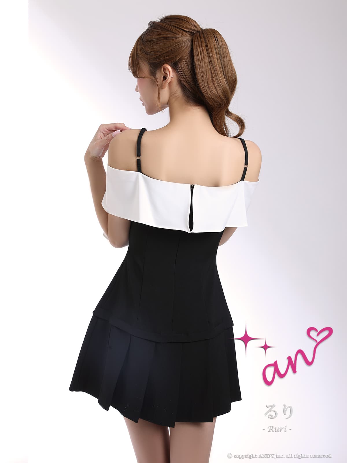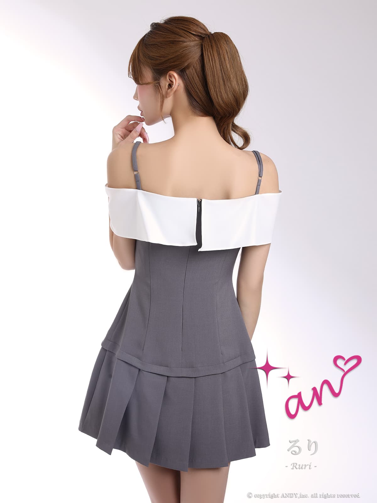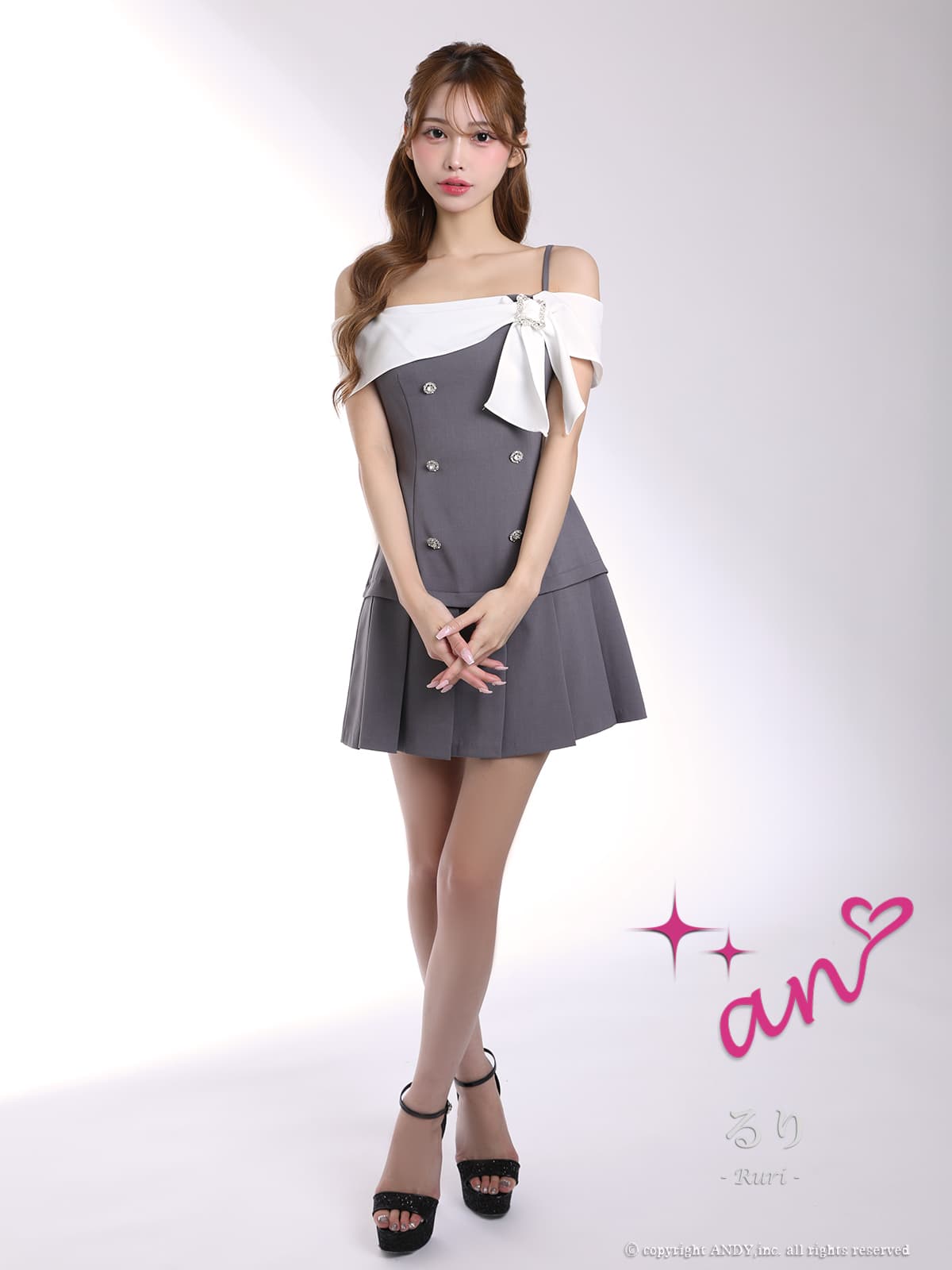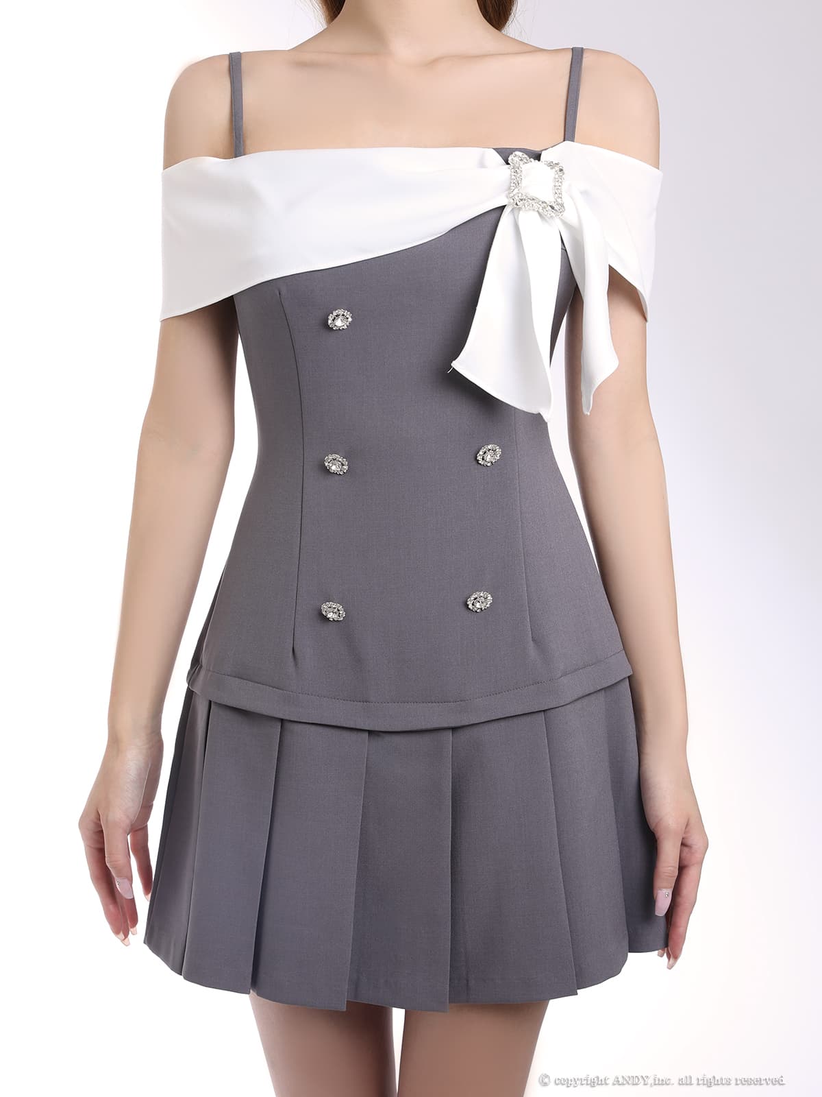 XSサイズあり【an/アン】ビジューバックル/ オフショルダー/ キャミソール/ プリーツ/ バイカラー/ ダブルボタン/ リボン/ フレア/ セットアップ風/ ミニドレス/ キャバドレス[OF05] [AOC4118-GYxW-2604]