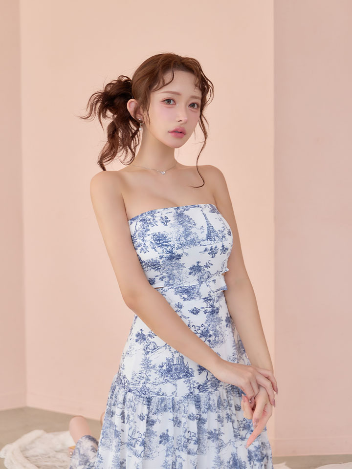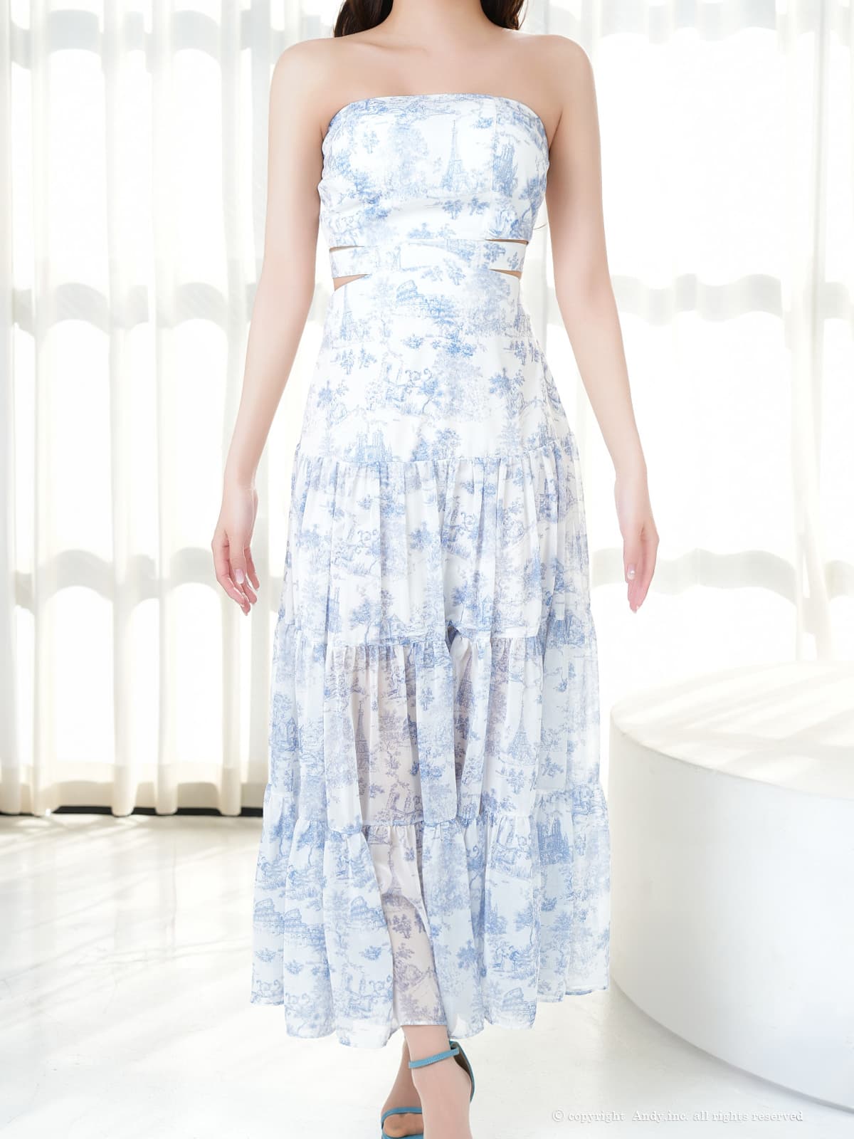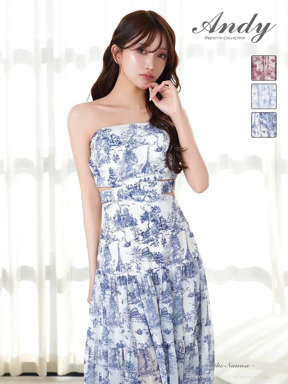 XSサイズあり【ANDY/アンディ】ベアトップ/ ウエストカット/ ノースリーブ/ 総柄/ リボン/ Aライン/ フレア/ ワンピース/ ロングドレス/ キャバドレス[OF05] [ON3067-WxNV-S260411]