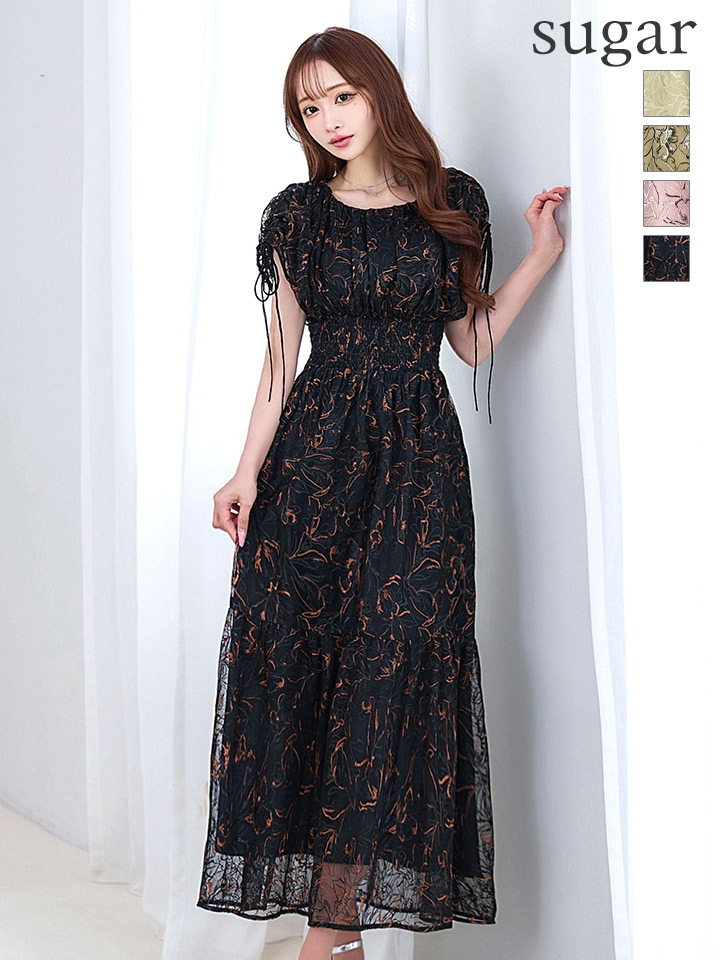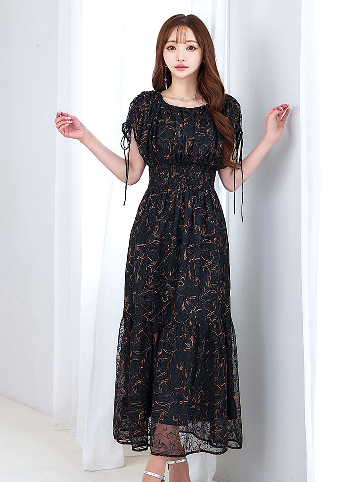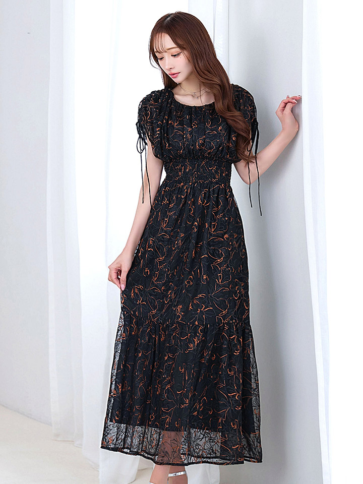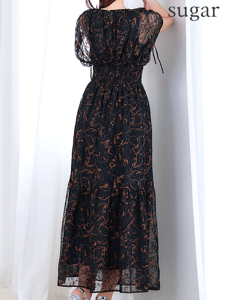フラワー刺繍とさりげない透け感が上品な雰囲気のミモレ丈ワンピースドレス
