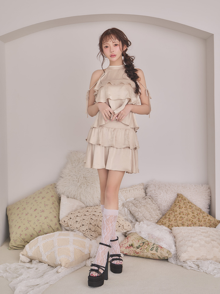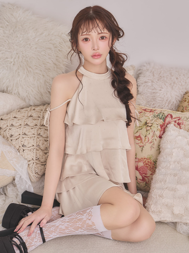 【予約商品/5月中旬-6月上旬発送予定】XSサイズあり【an /アン】ラインストーン/ ハイネック/ アメリカンスリーブ/ ショルダーリボン/ ティアード/ フレア/ ミニドレス/ キャバドレス[OF05] [AOC4120-BE-S260413]