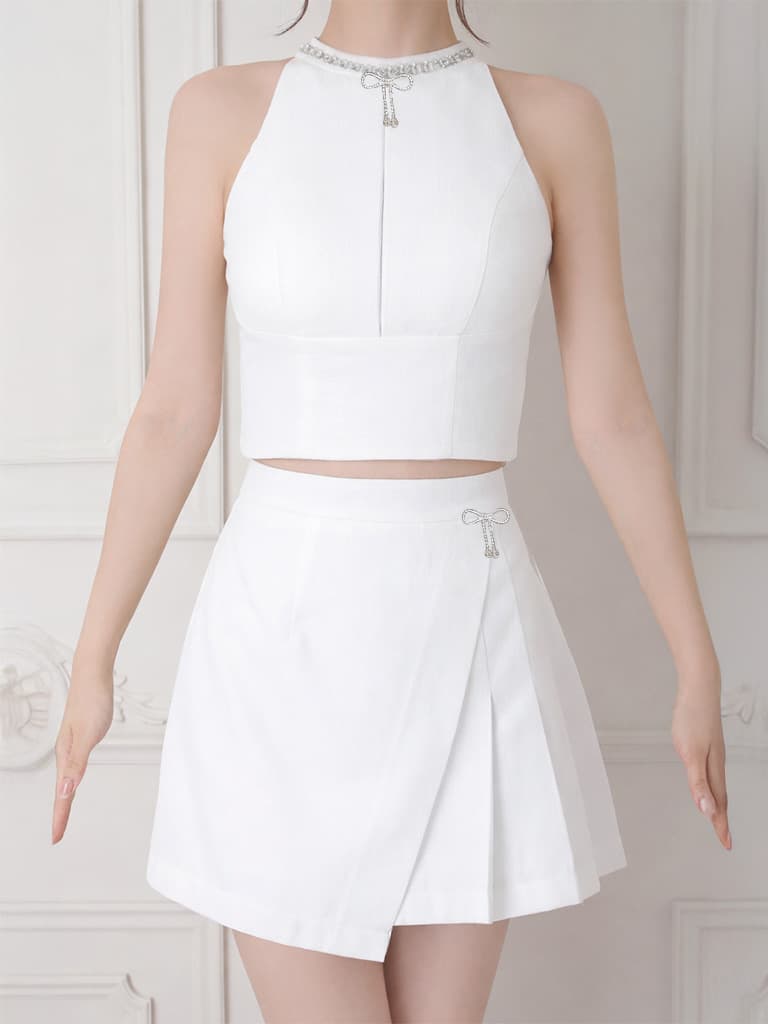 XSサイズあり【an/アン】ハイネック/ バストジップ/ ネックビジュー/ リボンブローチ付き/ プリーツ/ アシンメトリー/ フレア/ セットアップ/ ミニドレス/ キャバドレス[OF05] [AOC4108-GY-2604]