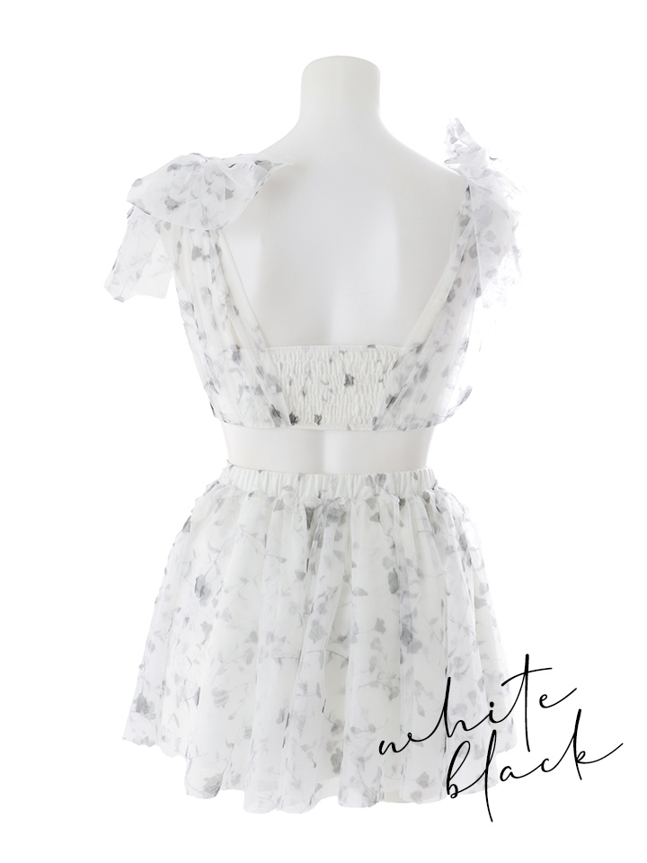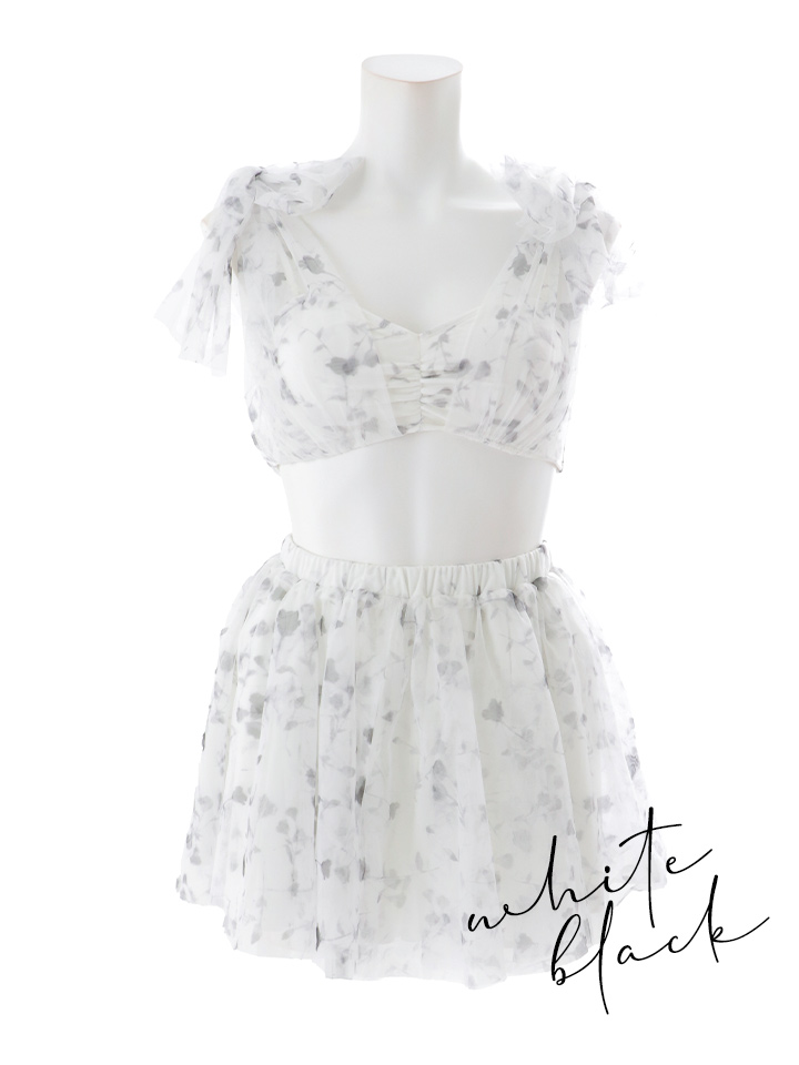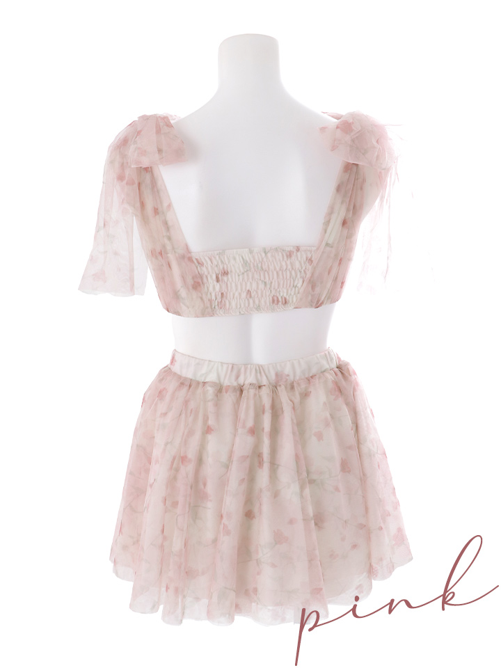 軽やかなチュール生地スカート付きで、動くたびにふんわり揺れ、女性らしさを演出します。