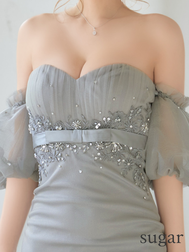 繊細なビジューと立体感のあるチュールが、胸元からウエストにかけて華やかさを演出。
